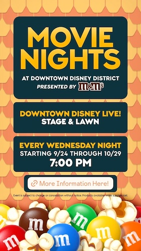 - Disneyland Resort will be hosting six Halloween-themed movie nights at the Downtown Disney LIVE! Stage & Lawn, every Wednesday from tomorrow, September 24th, through October 29th.