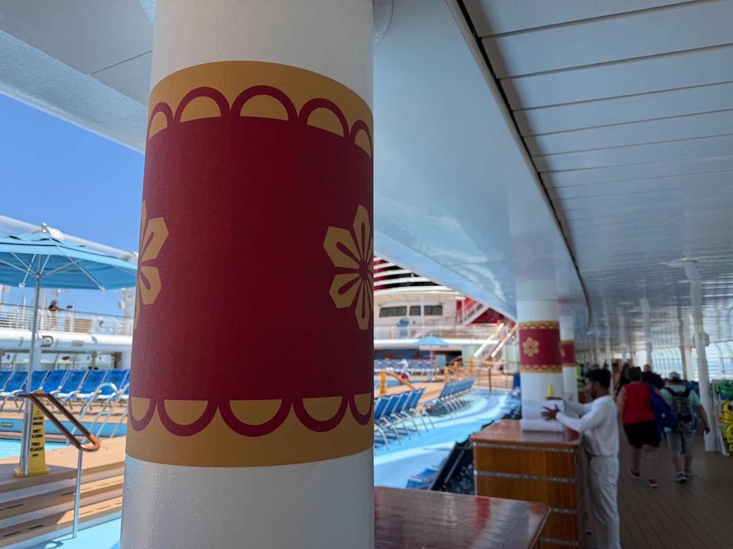 Heading out onto the deck, you’ll find even more decor in and around all the pools, slides and activities.
