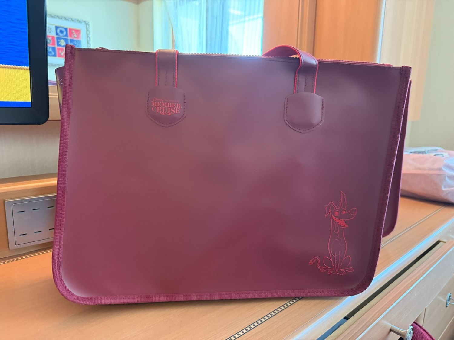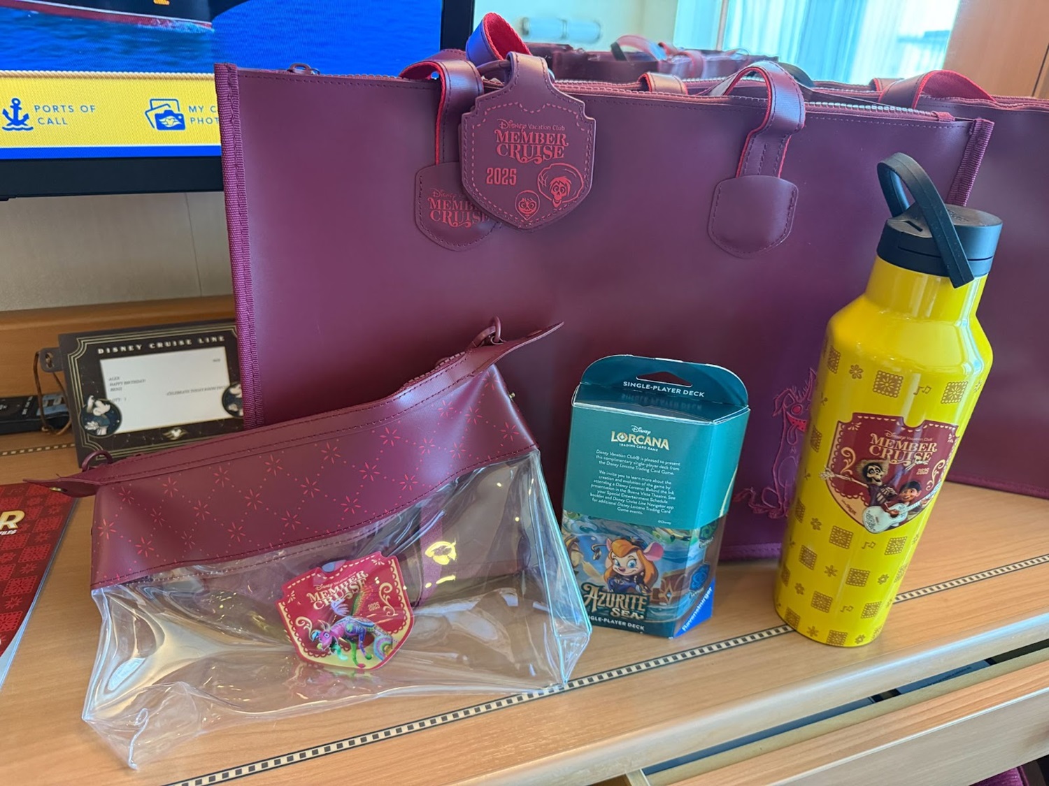 All guests aboard a DVC Member Cruise receive a ton of special gifts, which this year include a bag, a Corkcicle tumbler, and a single player deck of Disney Lorcana – Azurite Sea.