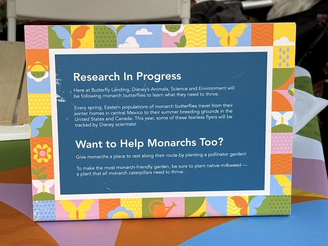 Guests can see this research for themselves at the EPCOT International Flower and Garden Festival. Guests can view the process every Tuesday at 9:30 a.m. outside Butterfly Landing, located near Journey Into Imagination With Figment in World Celebration. There, guests can keep a sharp eye out to see if they can spot the baby backpacks on these beautiful monarch butterflies.