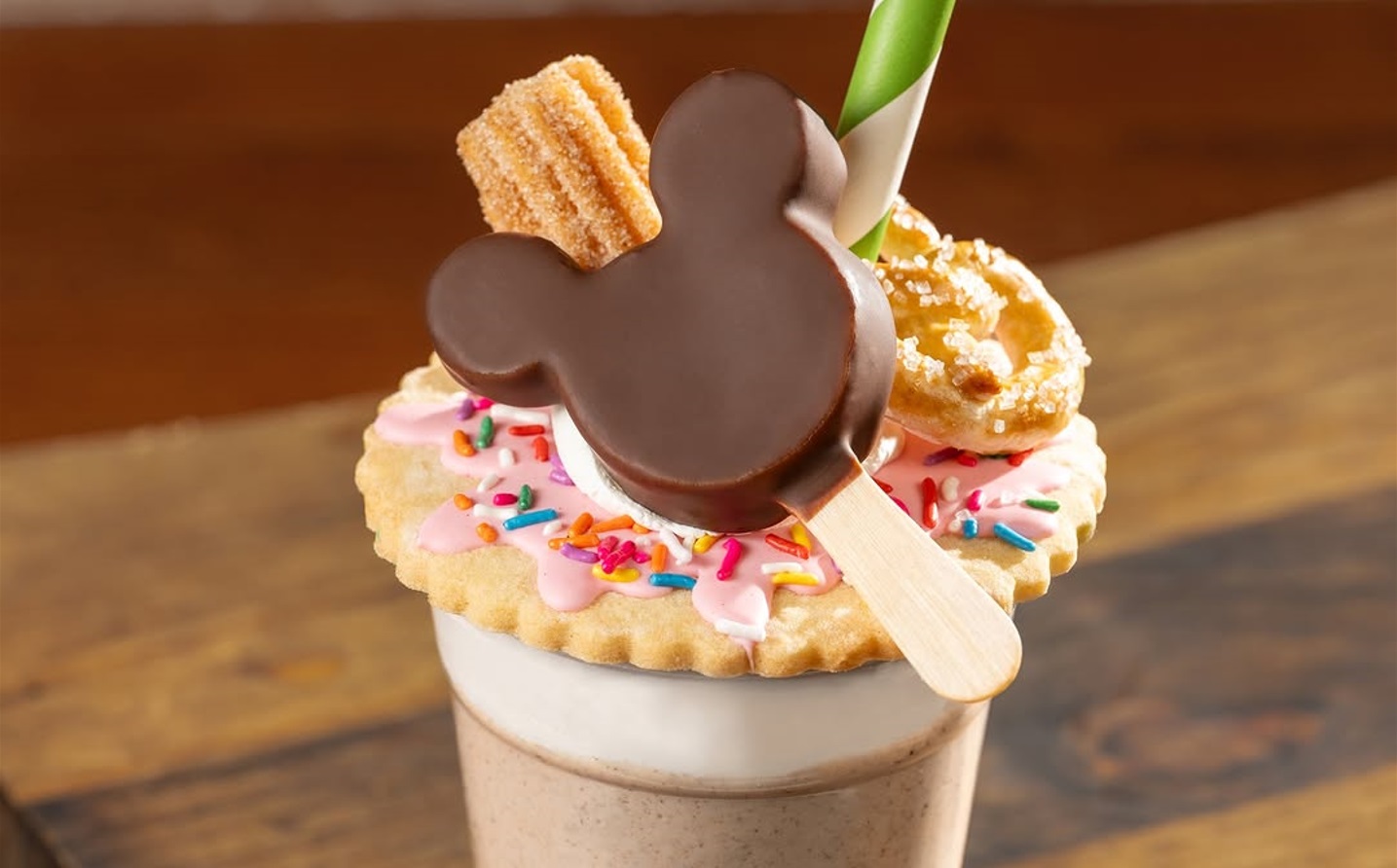 - This new churro milkshake is topped with whipped cream, a sprinkle “doughnut", a mini churro, a pretzel, and a “Mickey’s Premium Ice Cream Bar".