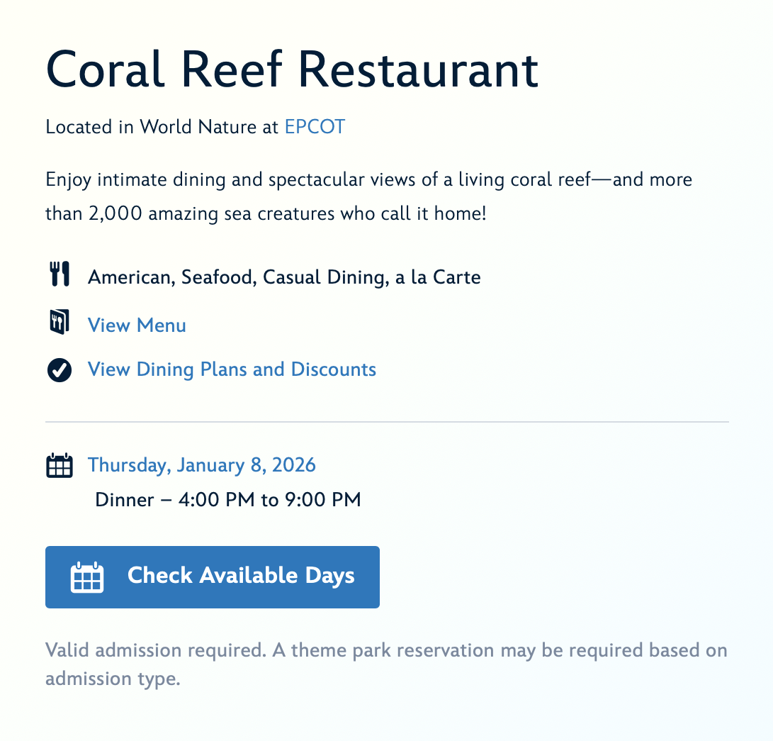 - Coral Reef Restaurant are available through early March, which is how far in advance the operating calendar is currently posted on the Walt Disney World website.
