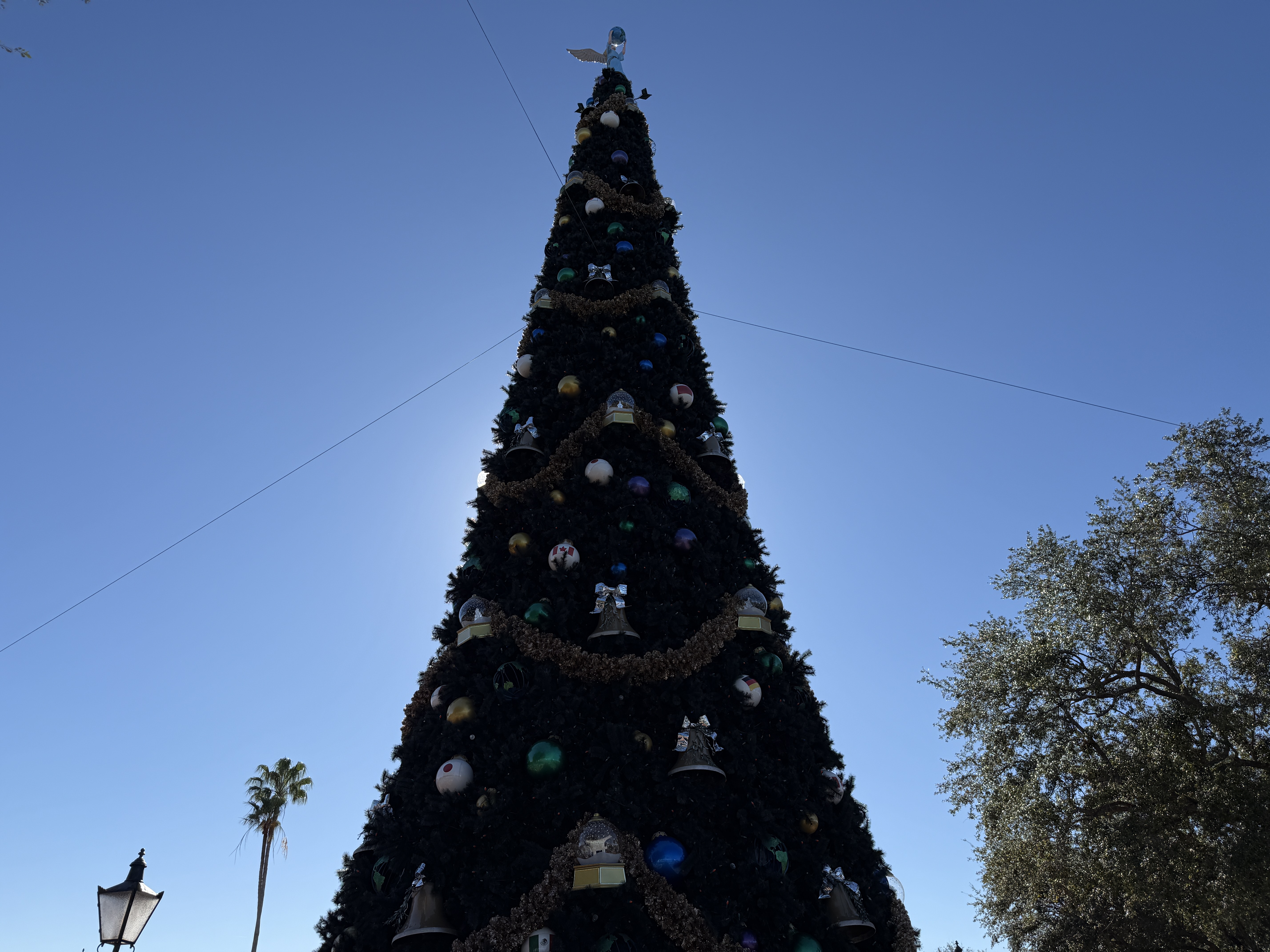 The park's main Christmas tree stands tall at the gateway to World Showcase.