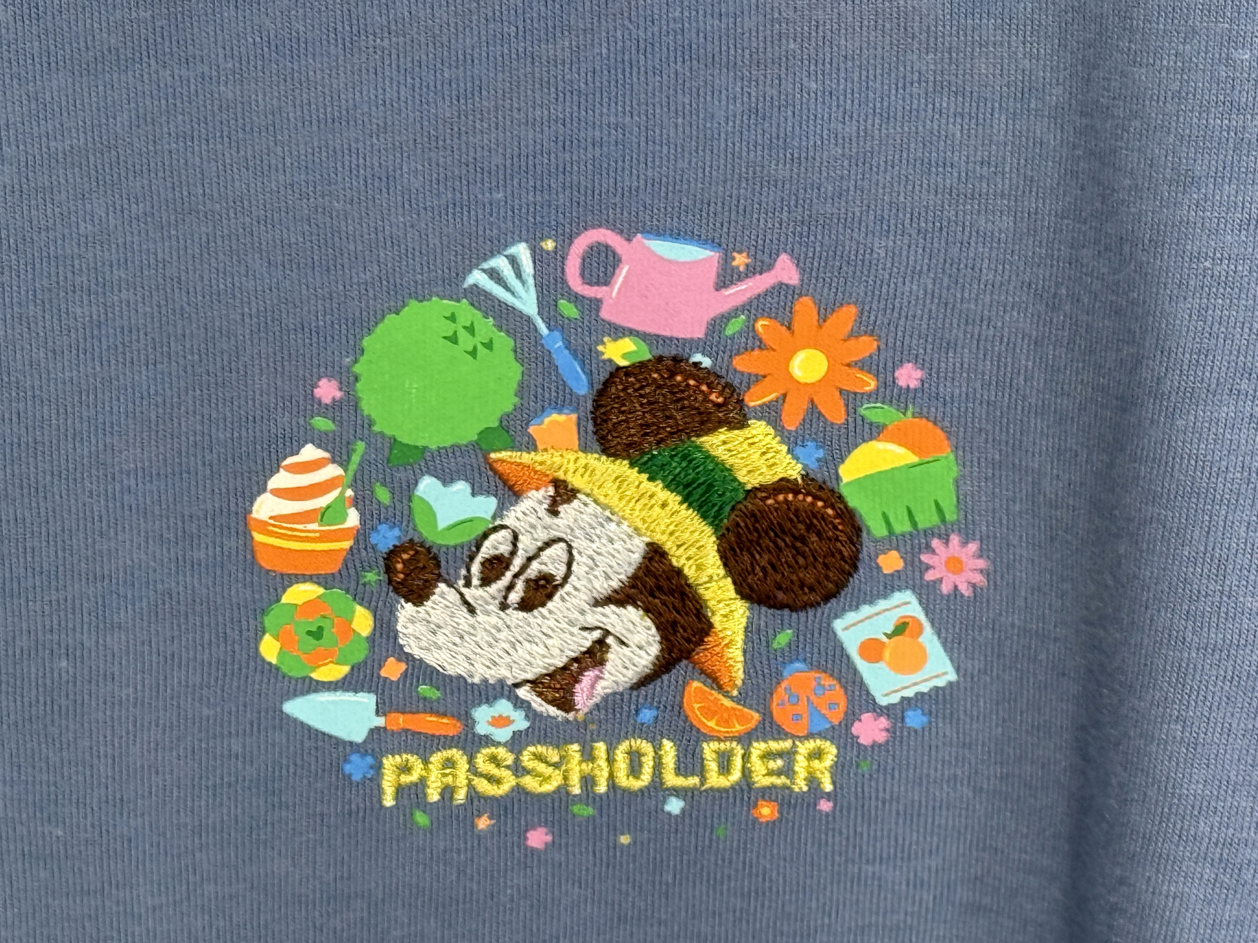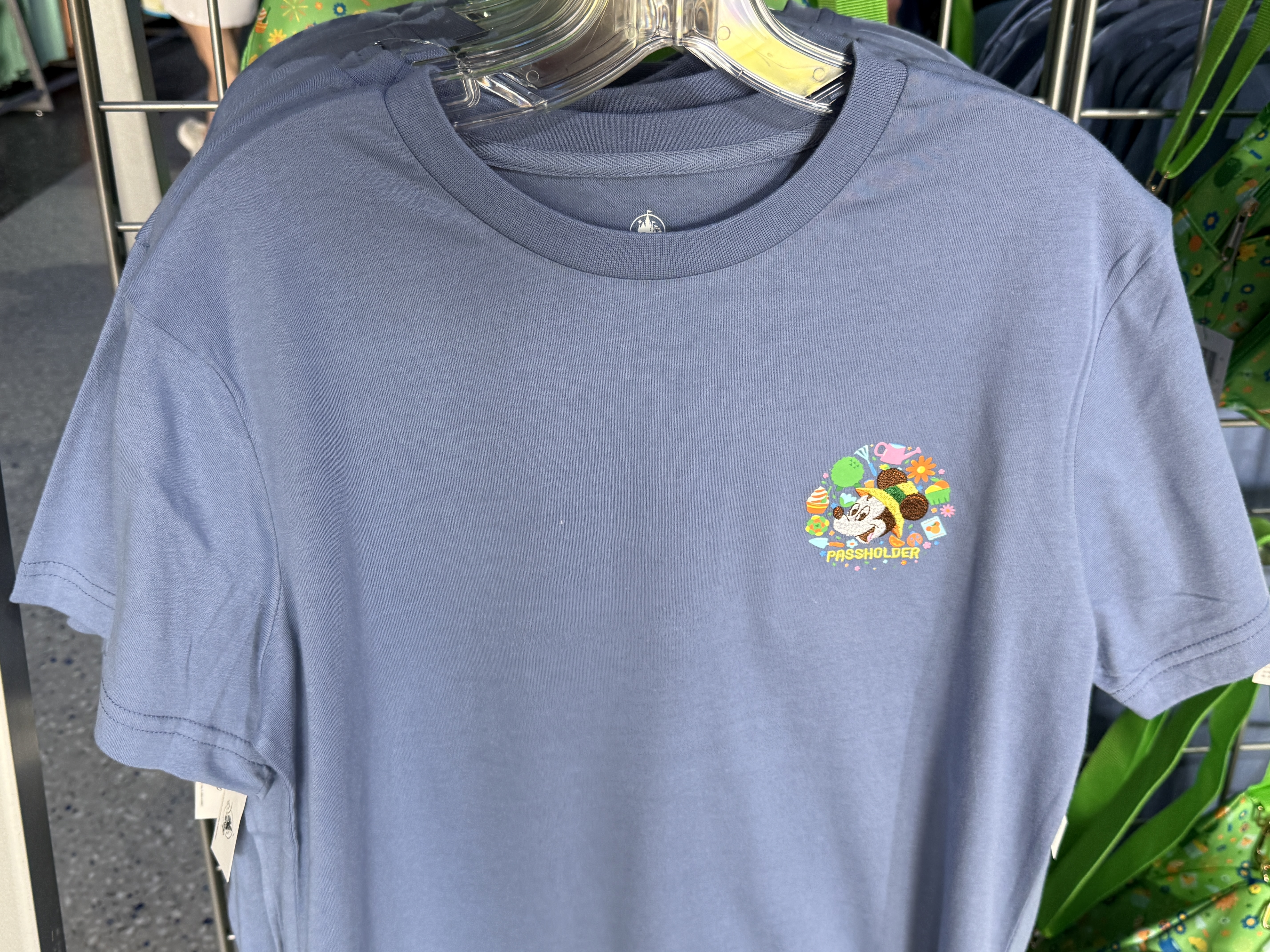 Special Passholder shirts for $36.99 can be picked up, featuring Mickey in his landscaping hat. The passholder motif carries over to a baseball cap for $29.99.