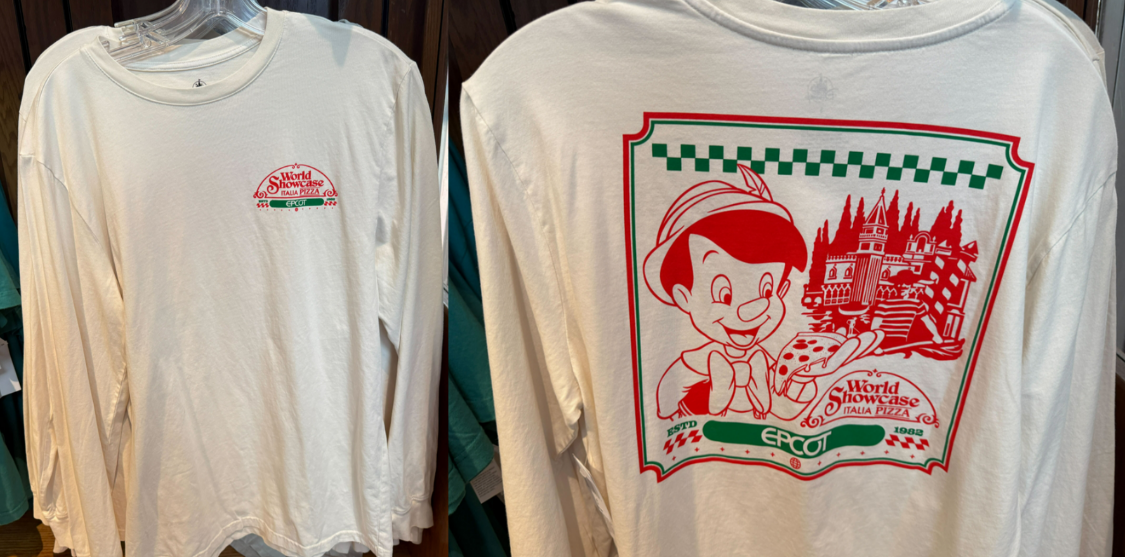 Pinocchio enjoys pizza on the Italy Pavilion t-shirt.