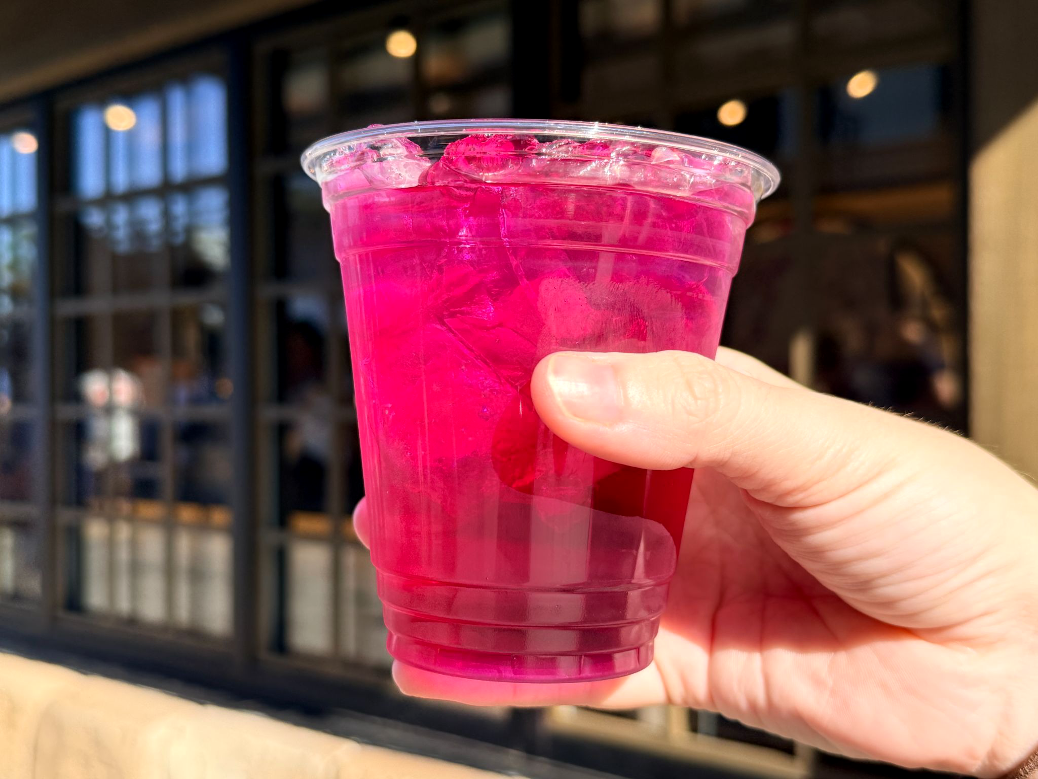 • The beverage is a gorgeous purple color, and is a sake cocktail enhanced with desert pear syrup and lime juice.