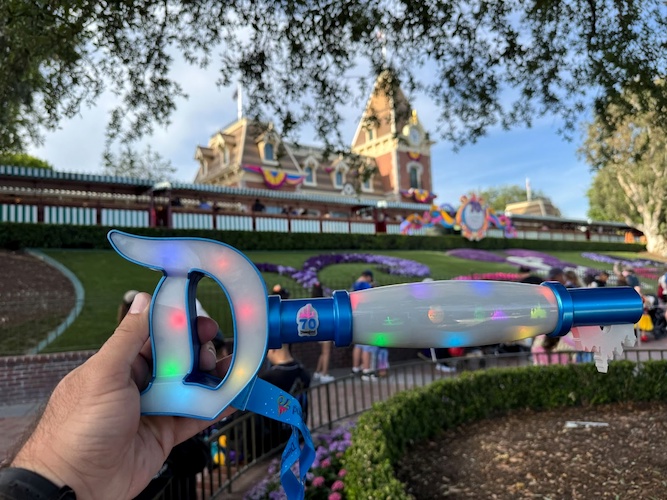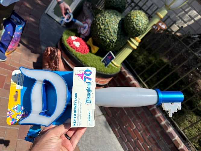 The Disneyland Resort has added a lot of exciting ways for Guests to celebrate Disneyland’s 70th Anniversary. Among them is an interactive merchandise item, the Key to Disneyland, a light-up toy that functions as a scavenger hunt at the park and a light-up wand at home. Each Key to Disneyland comes with a mystery pin, one of nine possible styles, and retails for $59.99. We received a complimentary Key to Disneyland during the 70th Anniversary kickoff event. Here’s what the experience entails.