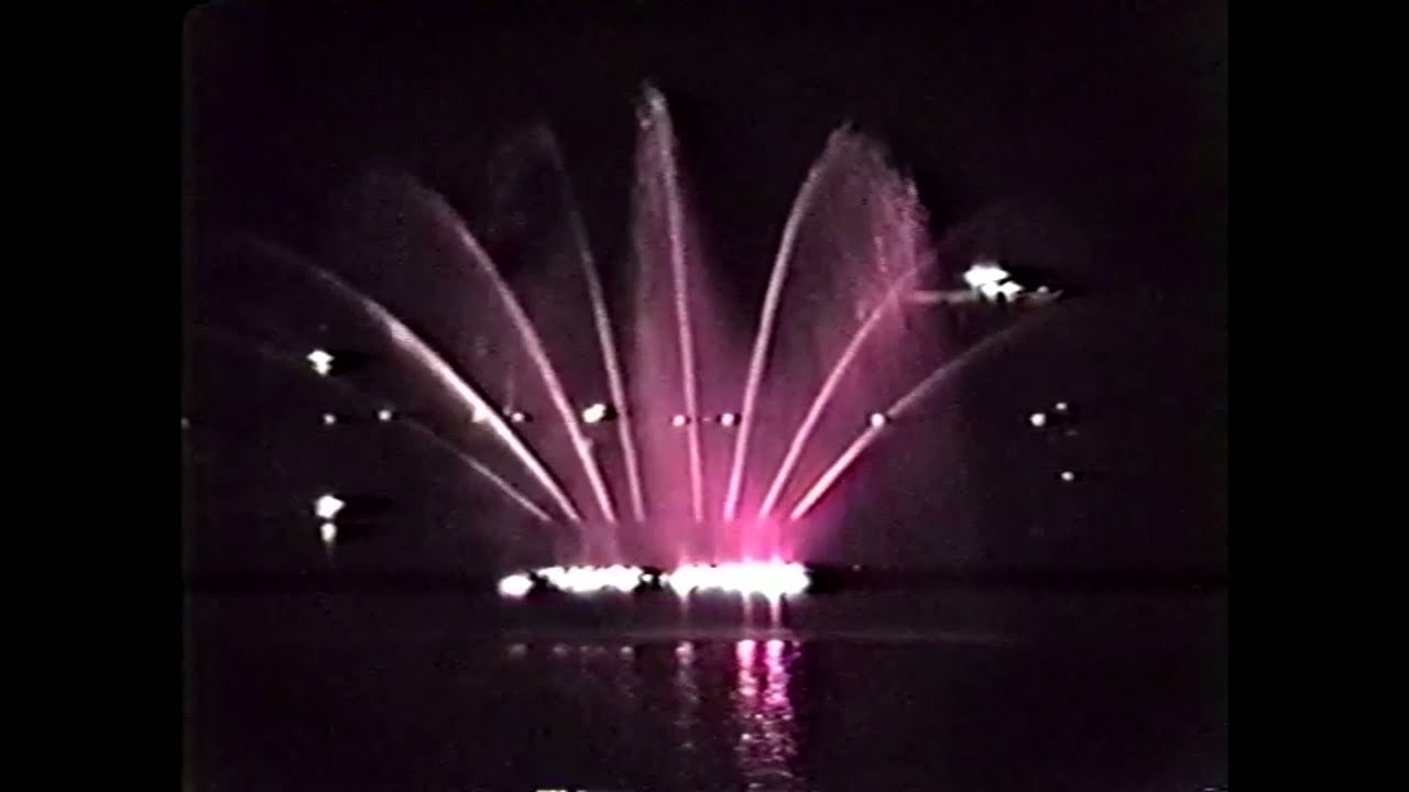 Like many of its successors, Laserphonic Fantasy utilized a central barge with some water fountains attached to it. Today, it’s also commonplace to use water screens, but this show was the first to use laser graphics on a water screen as well as the first to include non-continuous lines in laser animation.