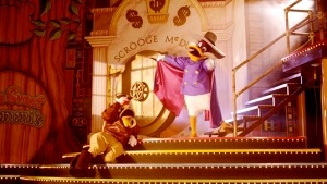 My first takeaway was that the theater was really cleverly designed with a door representing each of the shows. As the show started, one could hear some beeps before a computer named D.U.D.E. turned on and started rapping. It was so 90s coded and just really set the tone for what we’d be about to see. The rapping computer introduced all of the characters who would appear where they would pop onto the stage for a few seconds and wave to the audience. To close that part of the show out, the one human in the show, CJ, made her appearance with a little rap ditty before recruiting Darkwing Duck to help her in her endeavor to find Mickey.