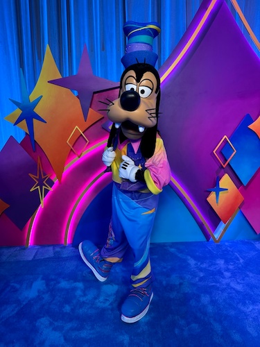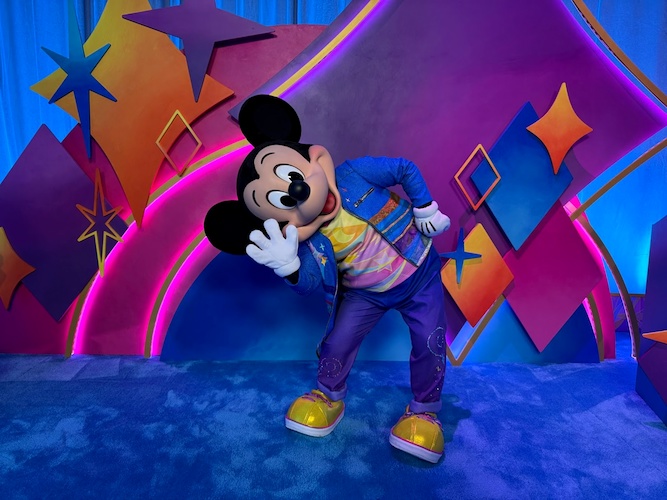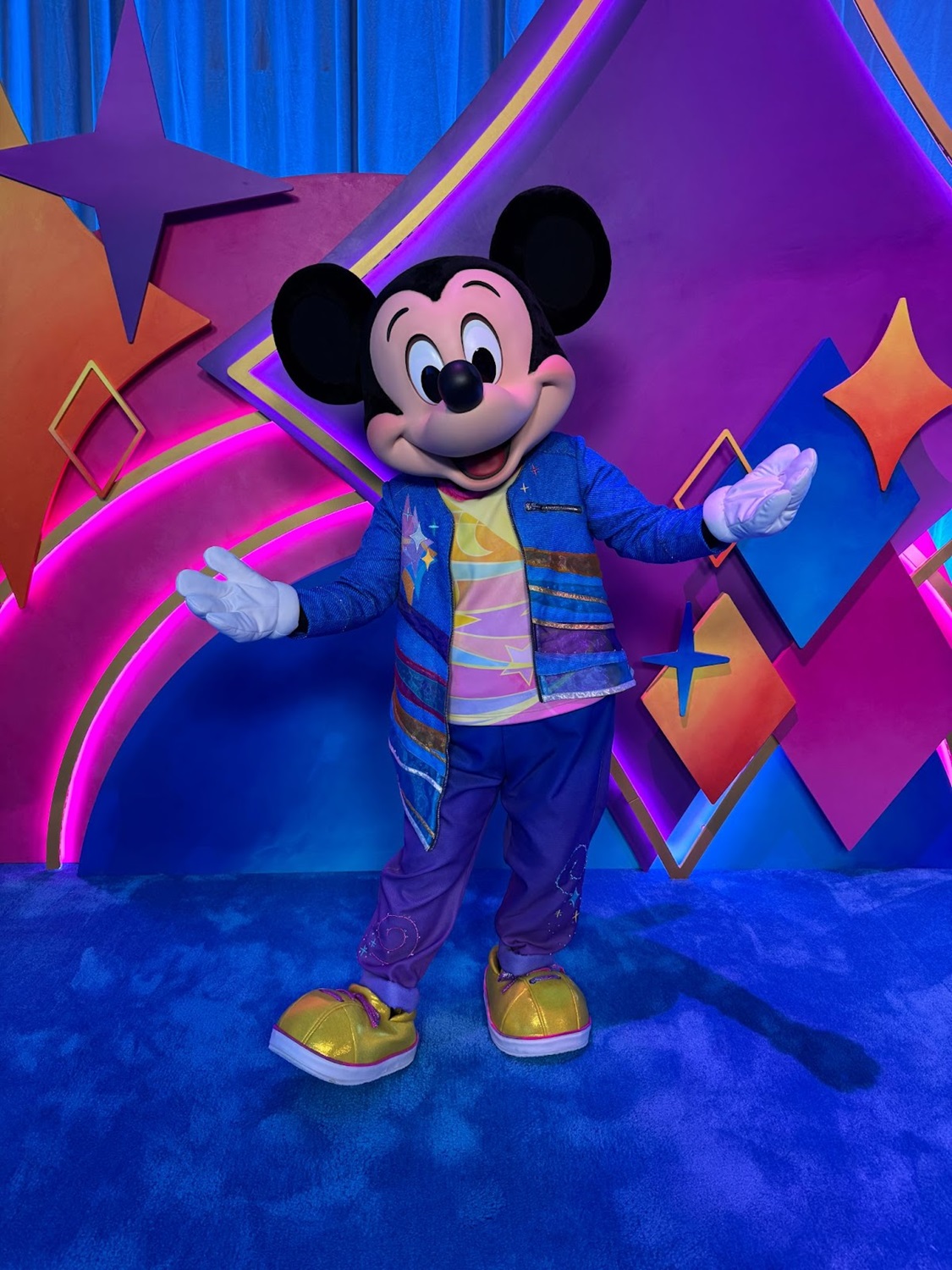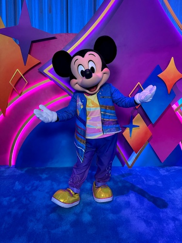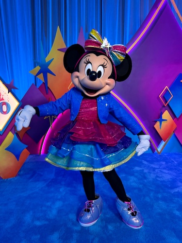 Mickey’s has some serious style for this celebration! With an asymmetric zip up jacket covered in glittering designs, a matching pair of cuffed pants, a complimentary shirt, and bright sparkly yellow sneakers, fans will need to dress to the nines to standout in photos with THE Mickey Mouse.