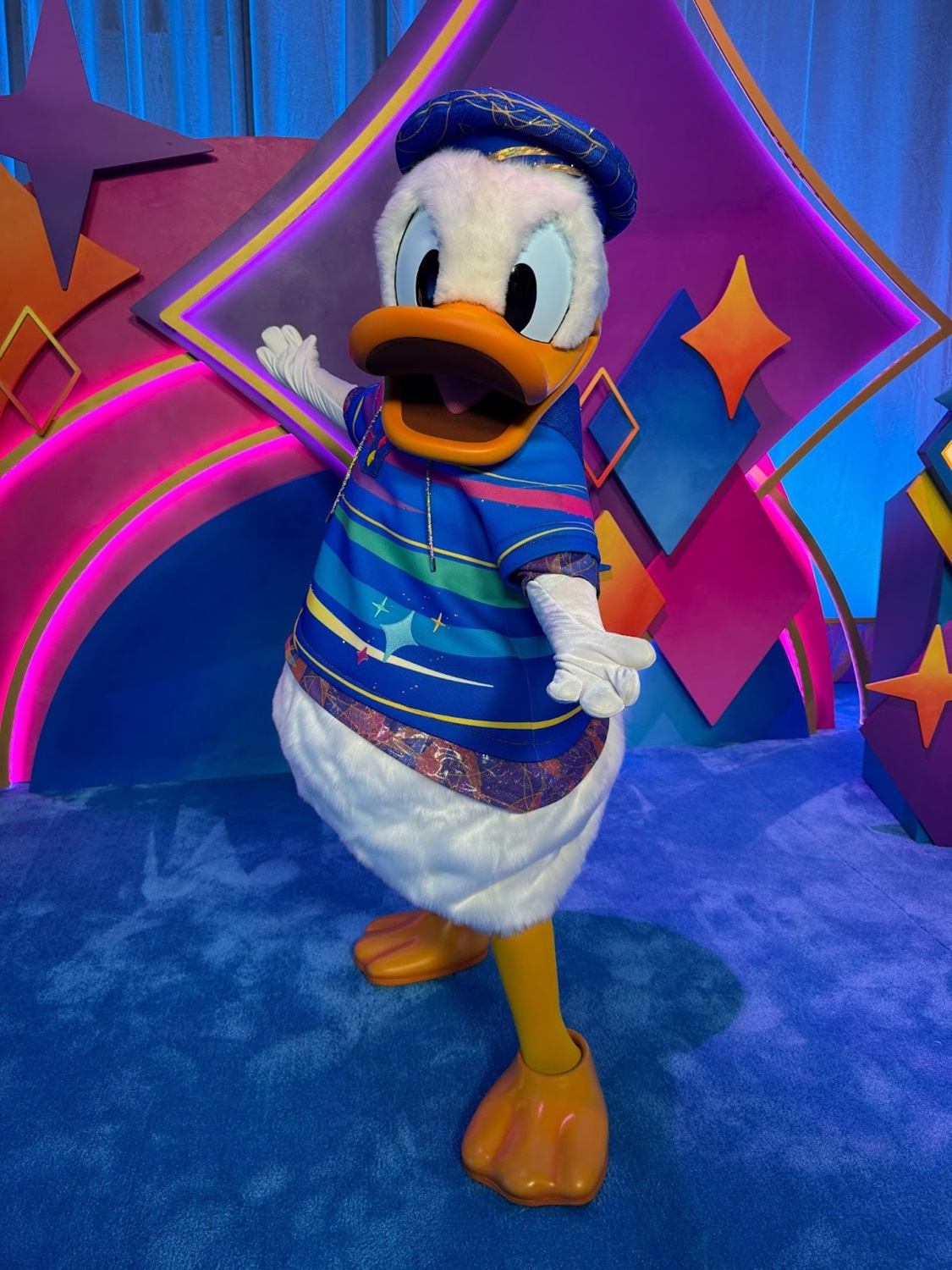 Donald’s look replaces his usual outfit with a rich blue base covered in a tornado of jewel-toned stripes. On the bottom of the sleeves and top, a gold detailed pattern ties together with his matching hat.