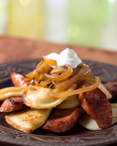 - Potato Pierogi with kielbasa, caramelized onions, and sour cream