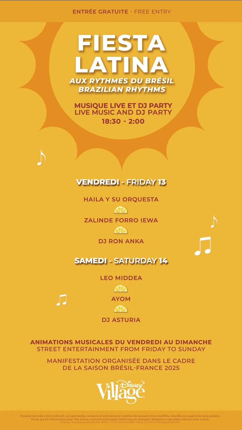 - Fiesta Latina is returning to Disney Village in celebration of the color and rhythm of Brazil, held as part of the Brazil-France 2025 Season.