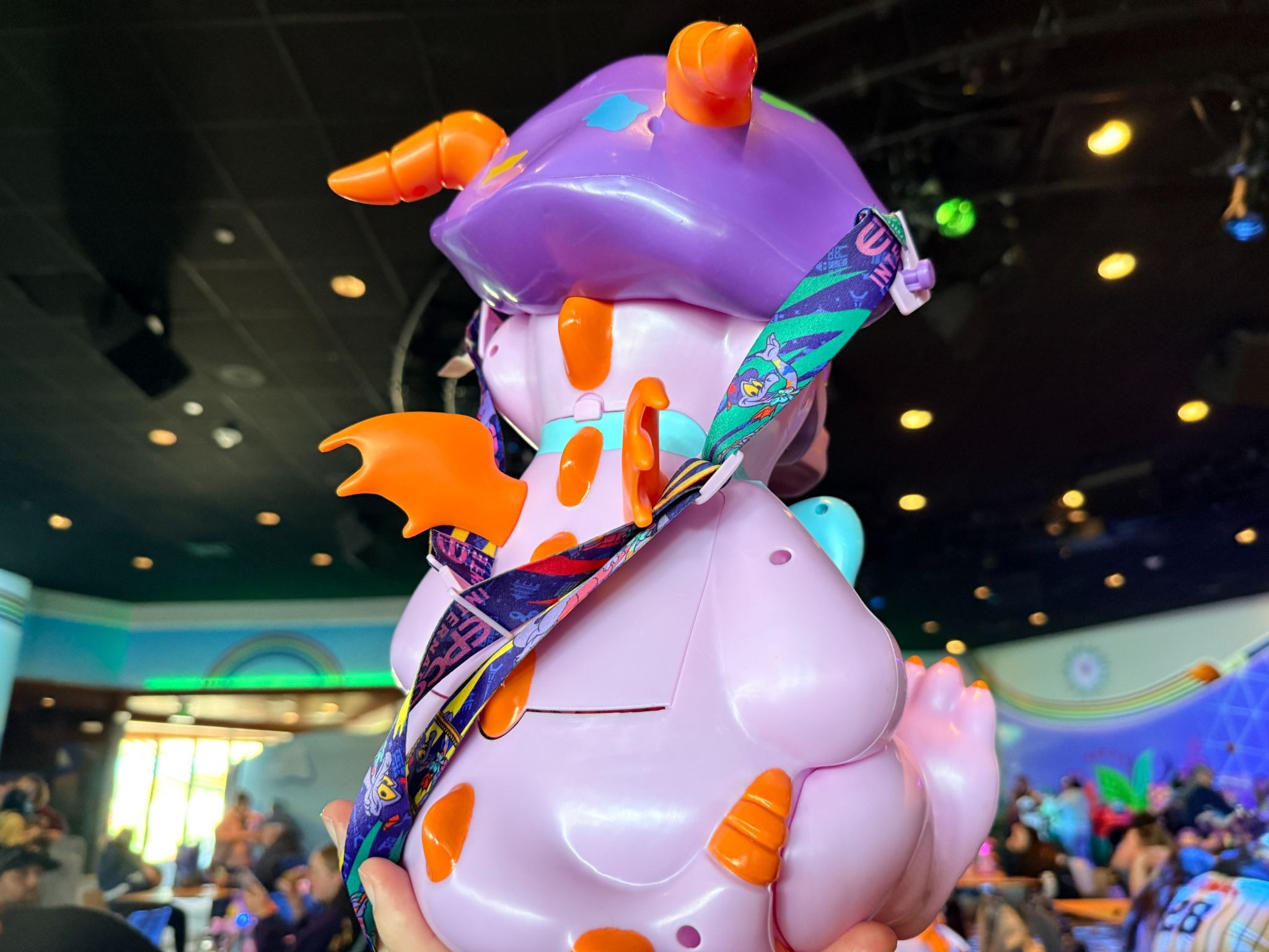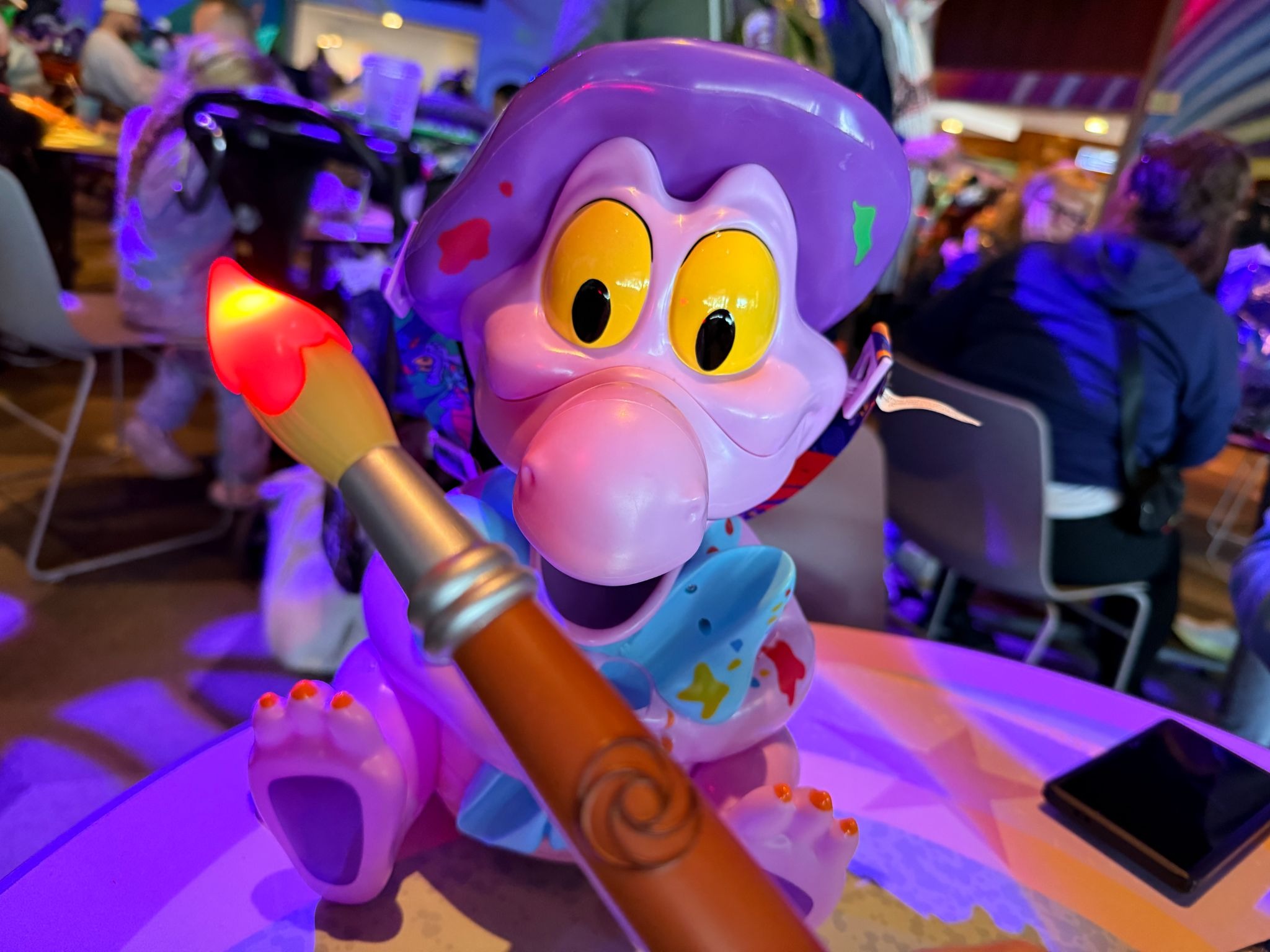 For the 2026 festival, Figment is dressed to impress in an artist’s beret, complete with a charming bow tied around his neck. A large, light-up paintbrush, complete with the Imagination Pavilion logo, adds an extra pop of color and glow, making the bucket as eye-catching at night as it is during the day.