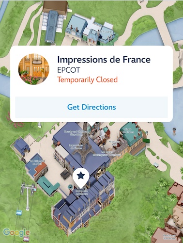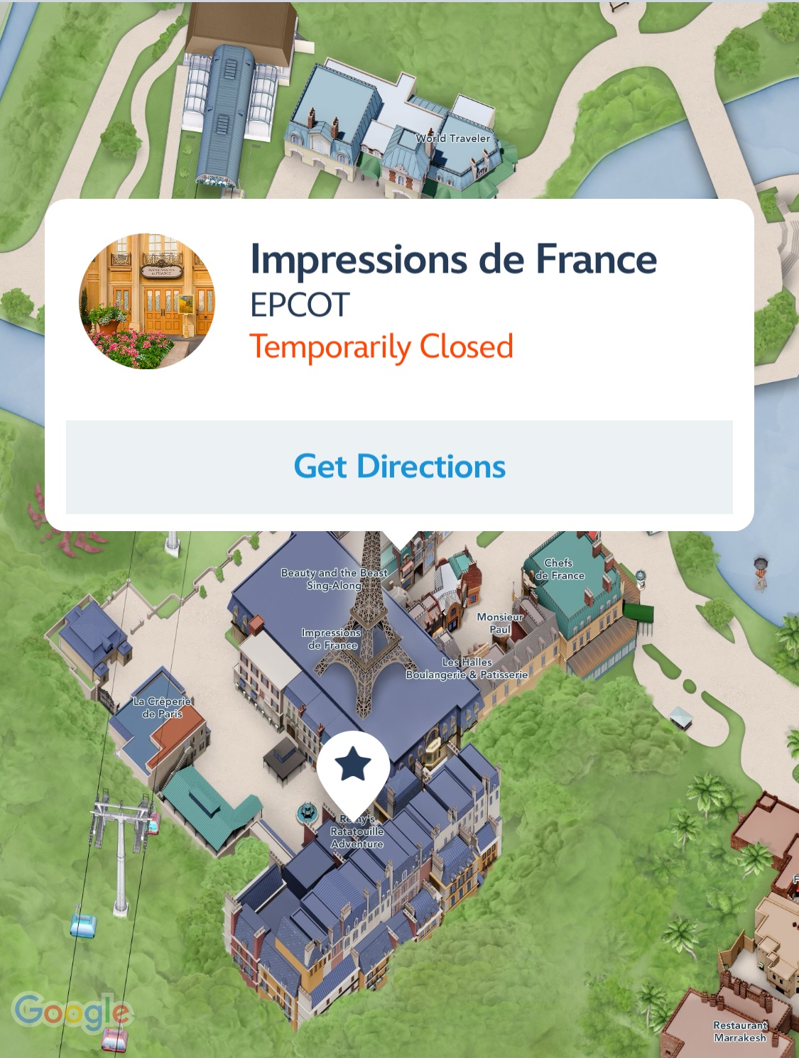 - As of 8:00 p.m. ET, both Remy’s Ratatouille Adventure and Impressions de France remain closed to guests. The pavilion’s shops and restaurants are likely closed as well.