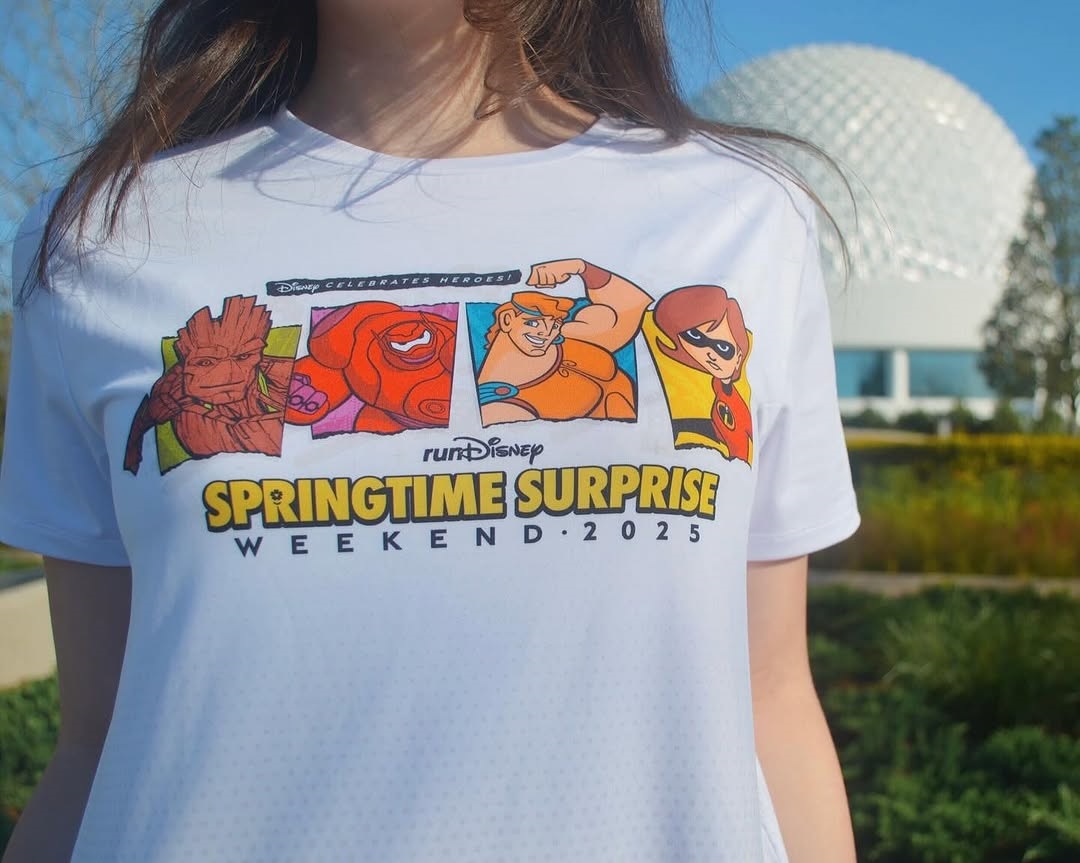 - The merchandise collection for the 2025 runDisney Springtime Surprise Weekend features race shirts showcasing Groot, Hercules, Mrs. Incredible, and Baymax.
