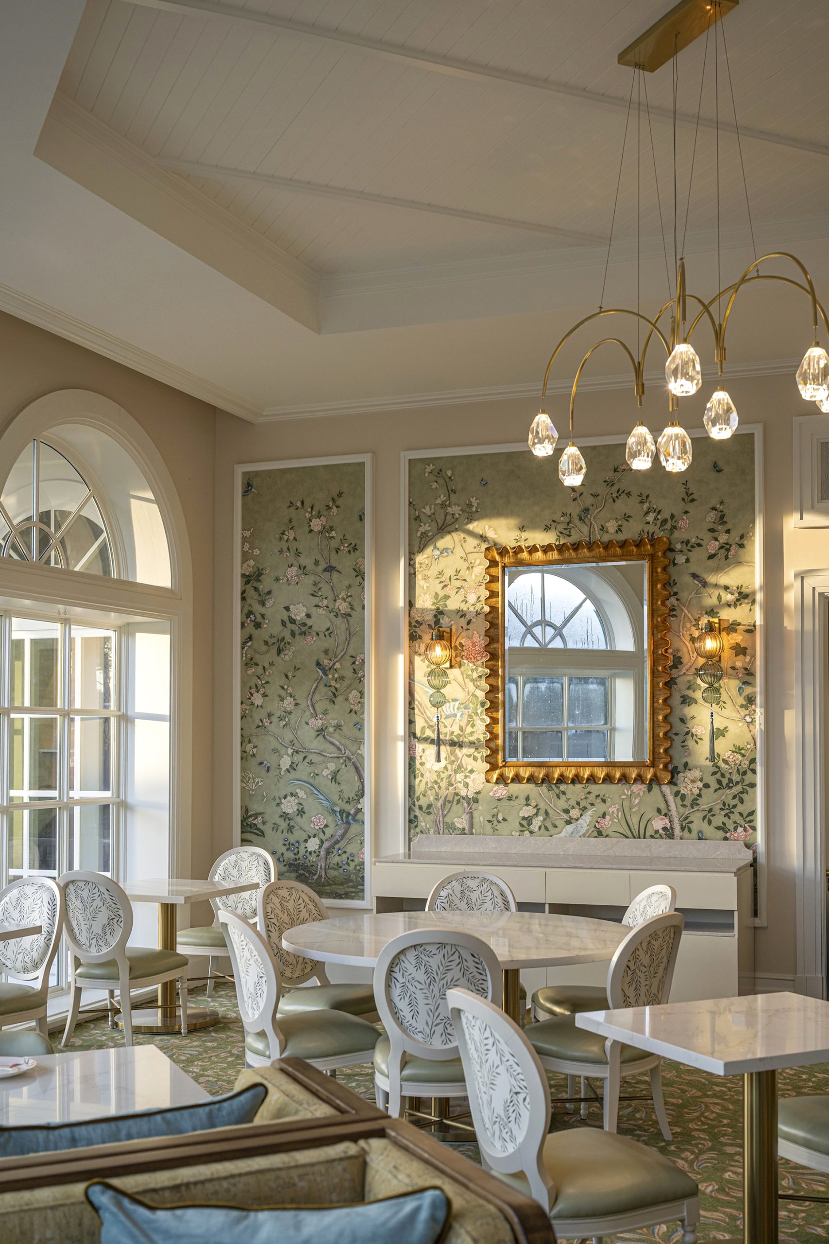 - The brass-framed mirrors resemble flower petals, reflecting an outdoor garden, while the stained-glass windows featuring native Floridian birds add color, character, and warmth.