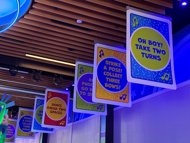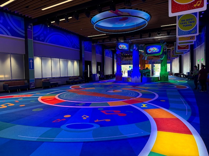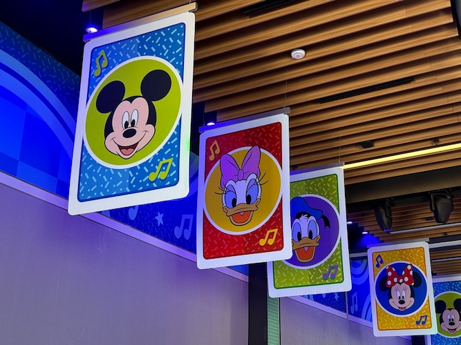 The flex-space has been decorated with colorful flooring, fun posters of Mickey and friends, and a DJ stage in the middle where all the fun will emanate from.