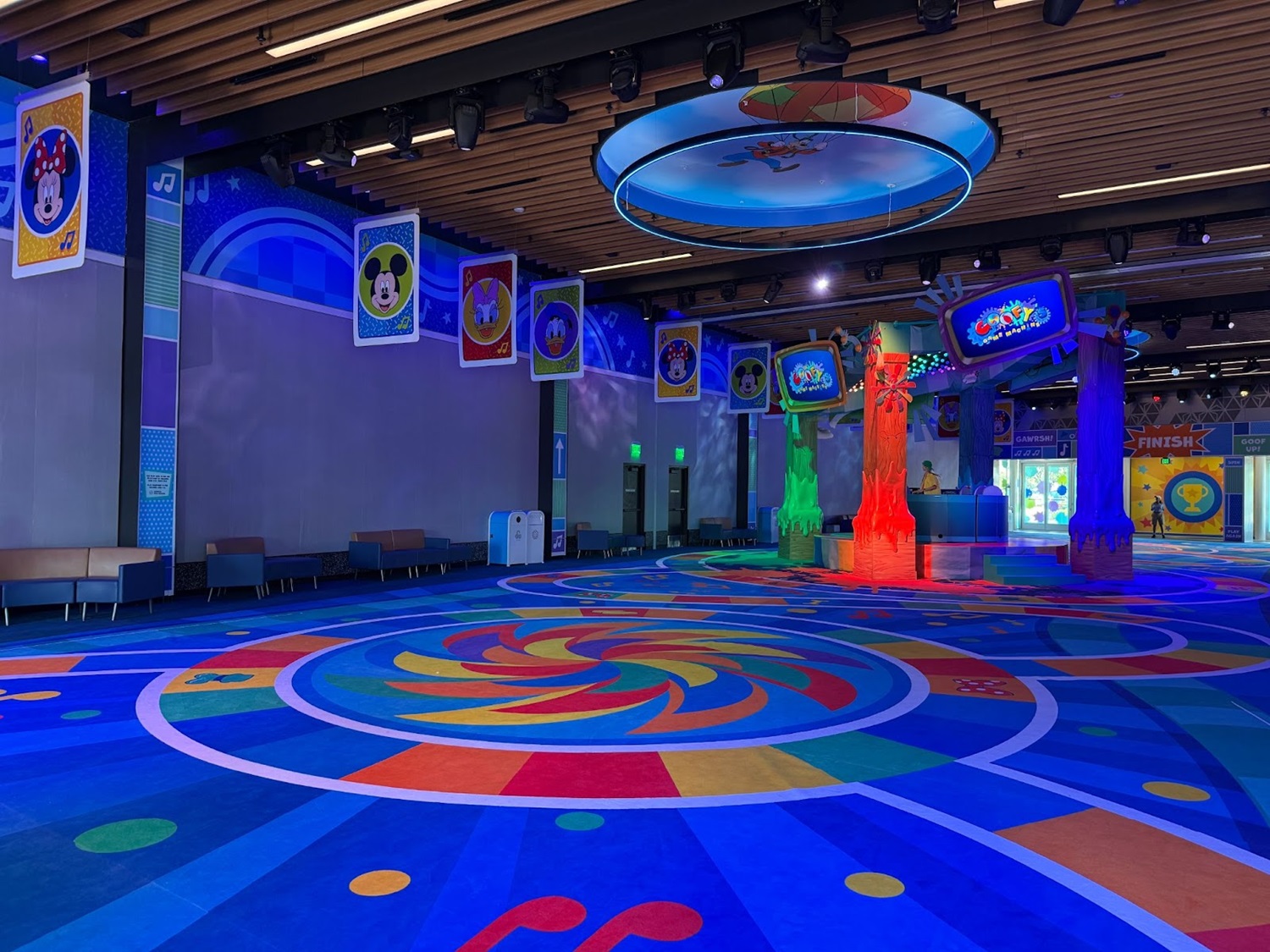 The flex-space has been decorated with colorful flooring, fun posters of Mickey and friends, and a DJ stage in the middle where all the fun will emanate from.