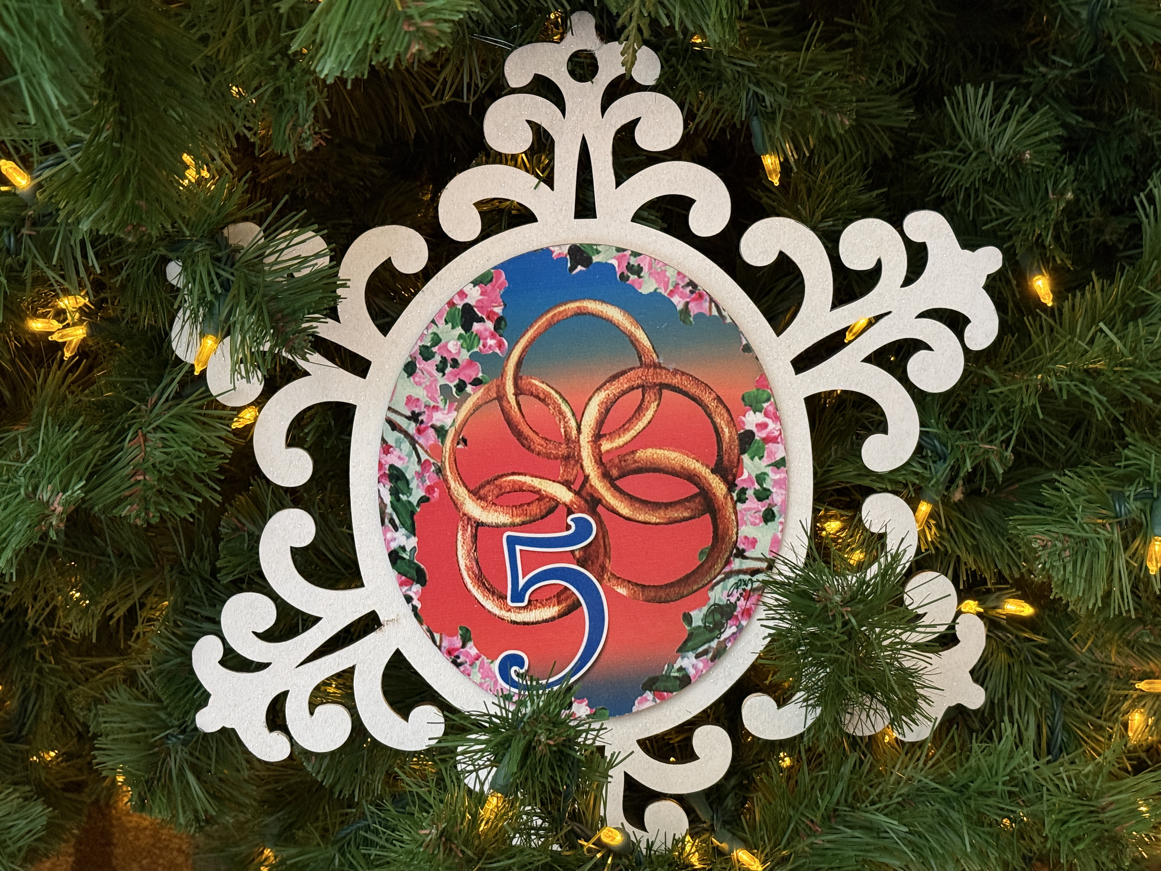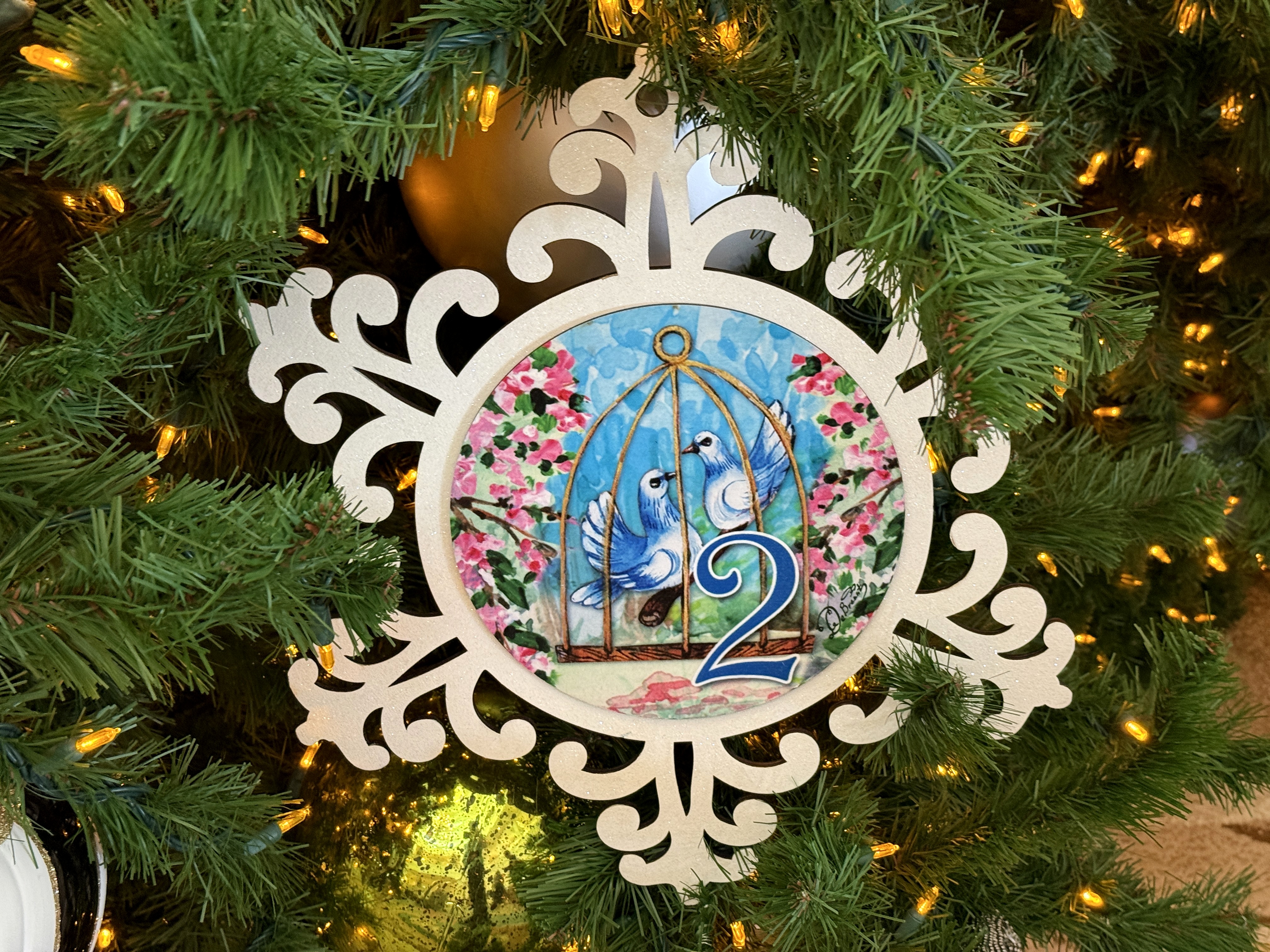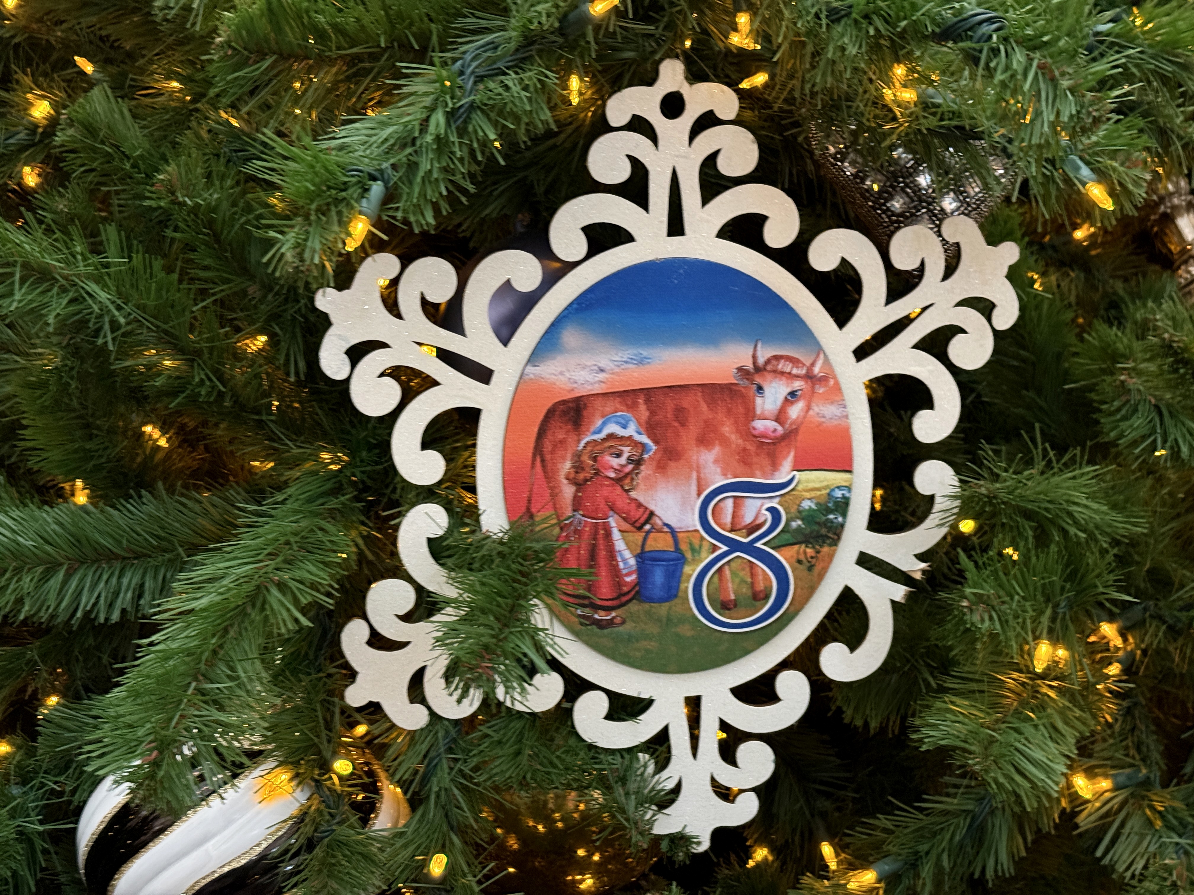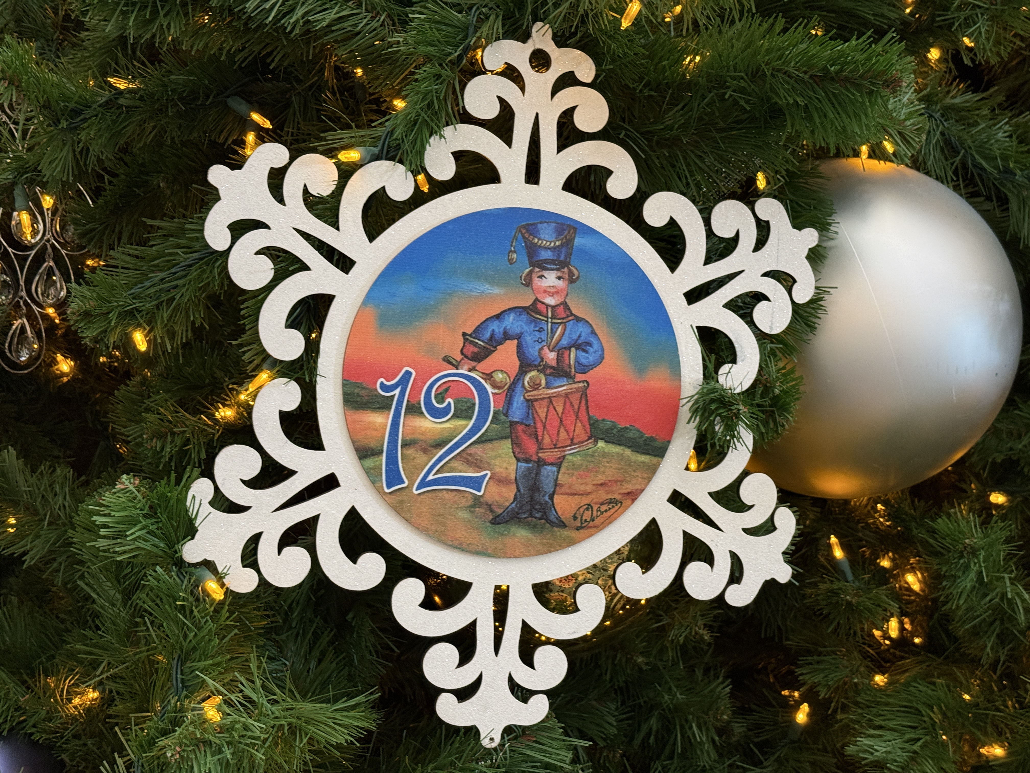 The tree itself features ornaments themed to "The Twelve Days of Christmas."