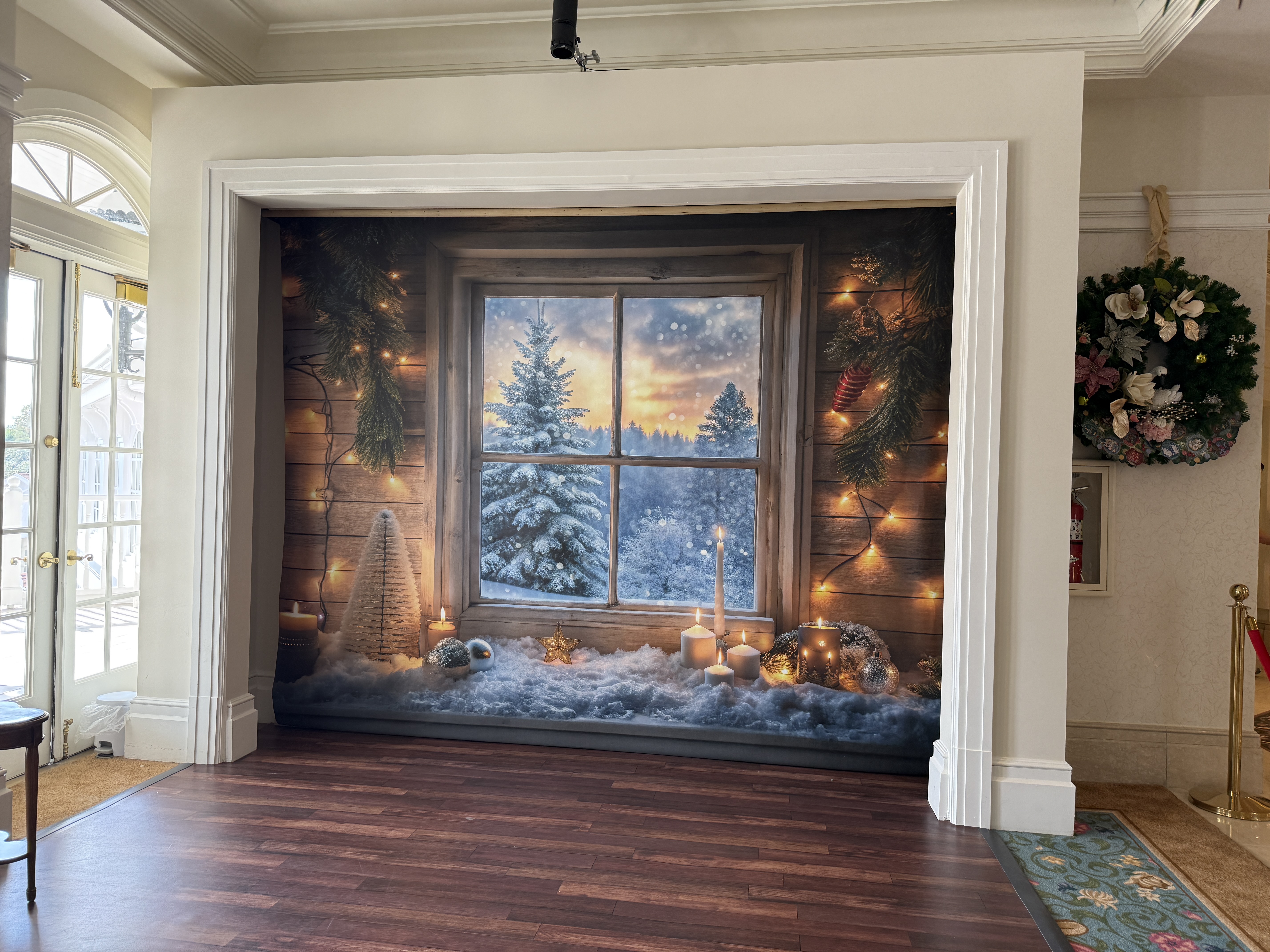 As soon as guests approach the porte cochère and the resort's lobby, they are immediately greeted by garland and small Christmas trees.
