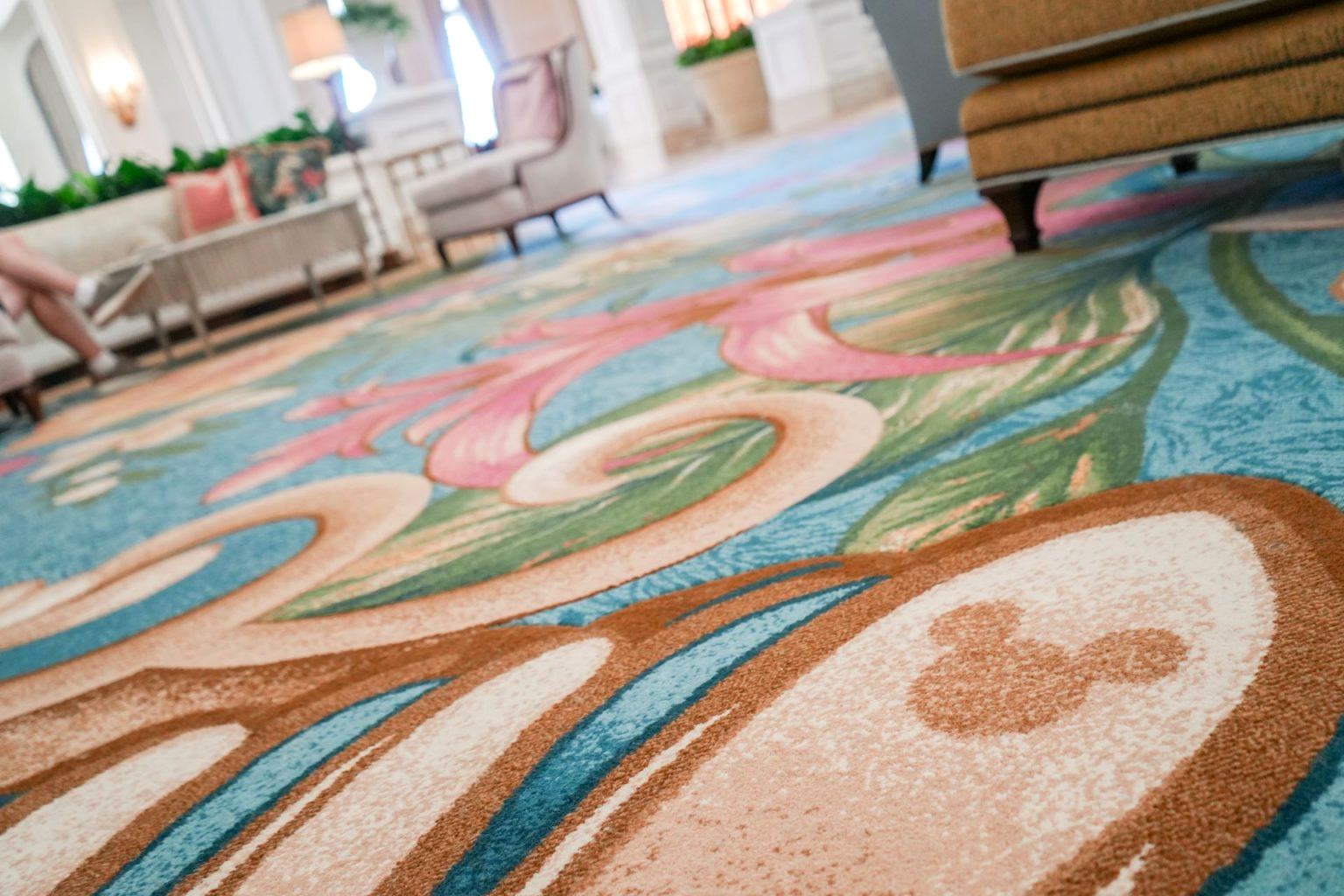 - New carpeting with Victorian-inspired borders and scrollwork featuring hand-drawn florals inspired by turn-of-the-century botanical studies. Also hidden throughout over 200 individual floral blossom patterns throughout the carpet of the lobby, a staple of any Disney hotel, the hidden Mickeys!