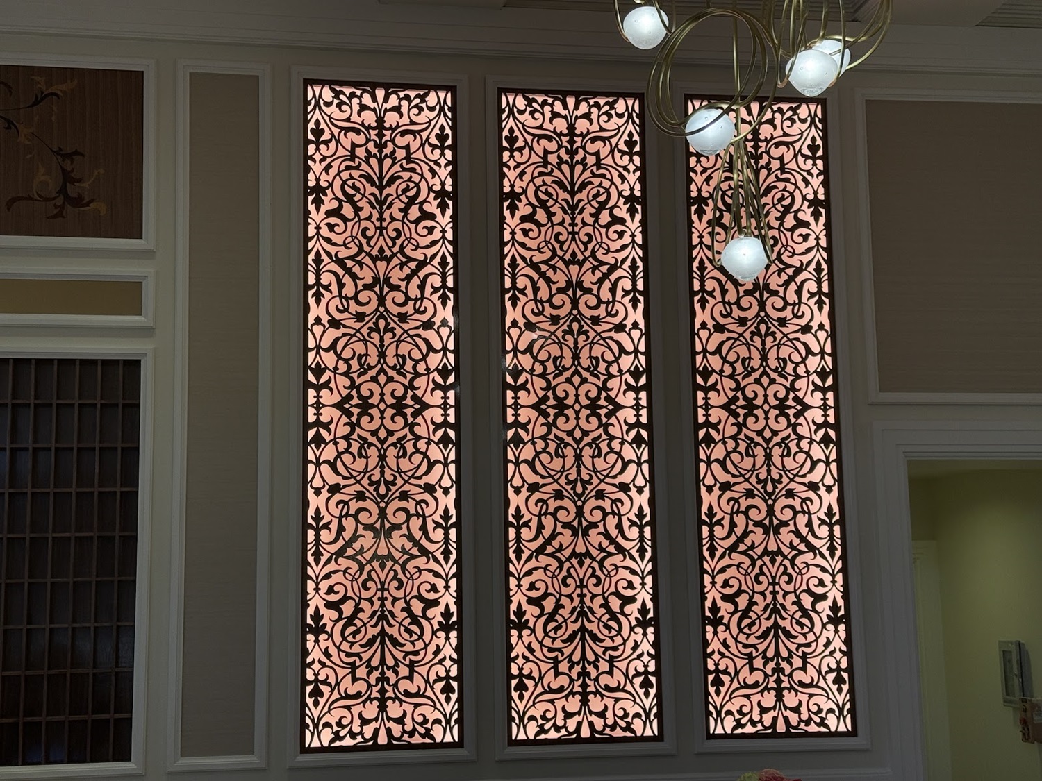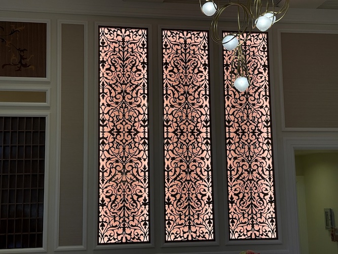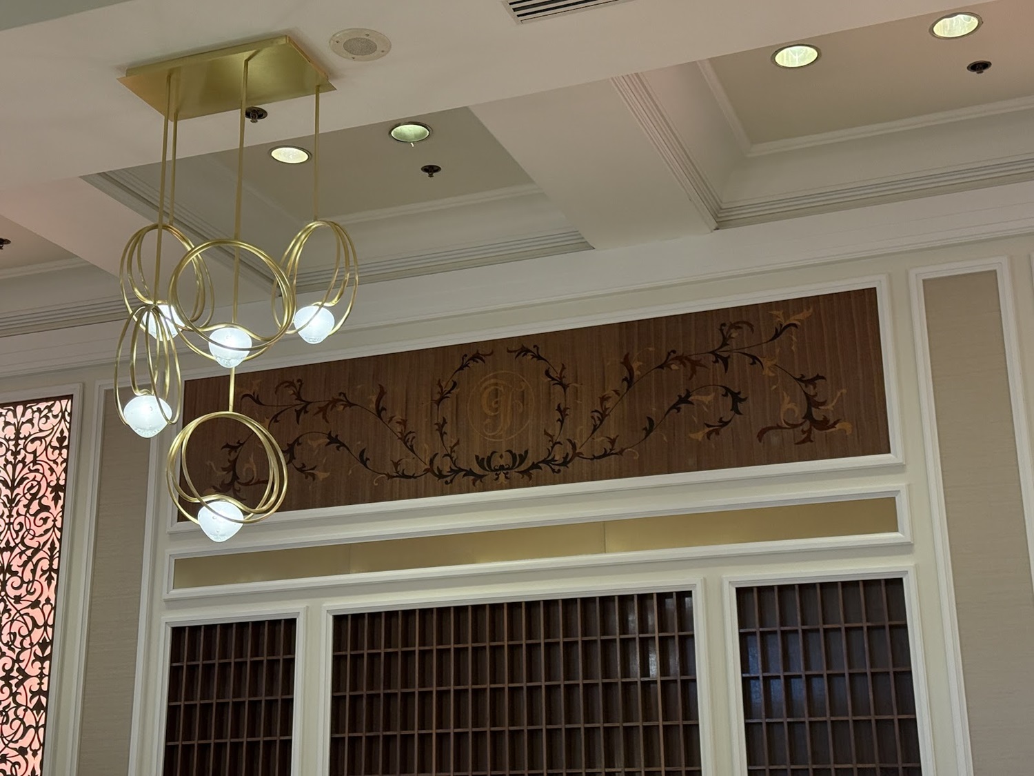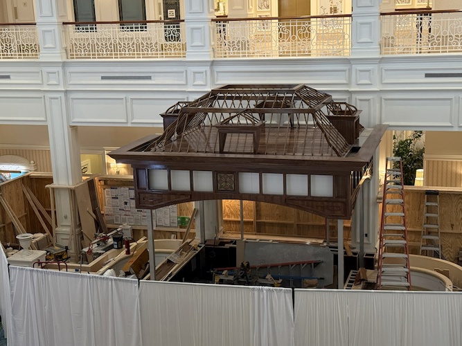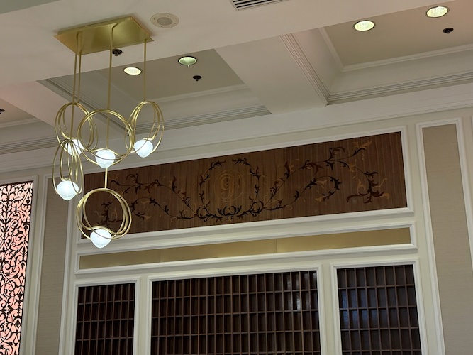Walls are down at the Check-In area of the resort, revealing some elegant new lighting designs to the area. There is also a classic Grand Floridian logo and filigree design flourished on the wall in this area as well.