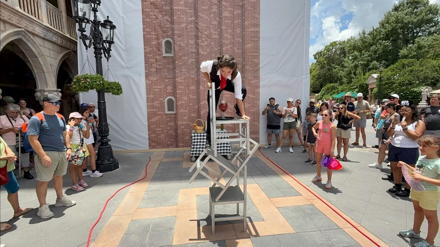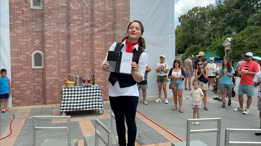 - A new performer has been spotted in EPCOT’s Italy Pavilion. Her name was not listed on the schedule, so for now we’re calling her “Grazie" (Italian for “Thank you") based on the note she holds up at the end of her act.