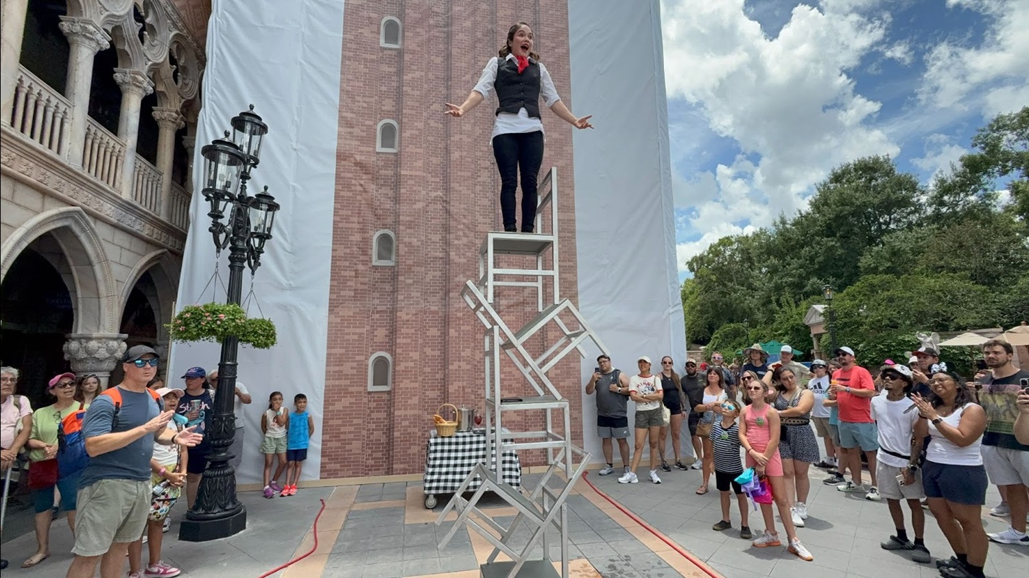- A new performer has been spotted in EPCOT’s Italy Pavilion. Her name was not listed on the schedule, so for now we’re calling her “Grazie" (Italian for “Thank you") based on the note she holds up at the end of her act.
