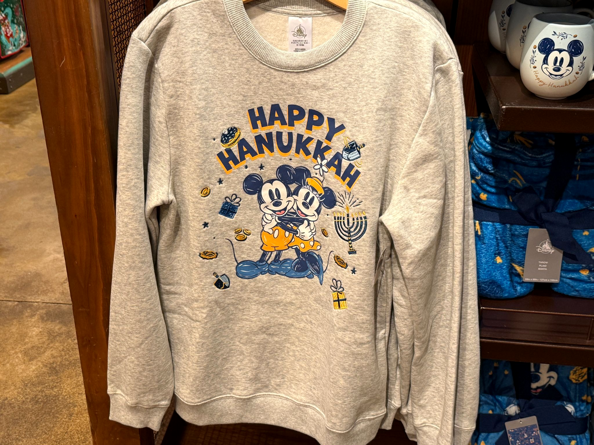 - First up we have a festive crewneck feature Mickey and Minnie surrounded by a menorah, a dreidel, gelt (chocolate coins), and latkes.