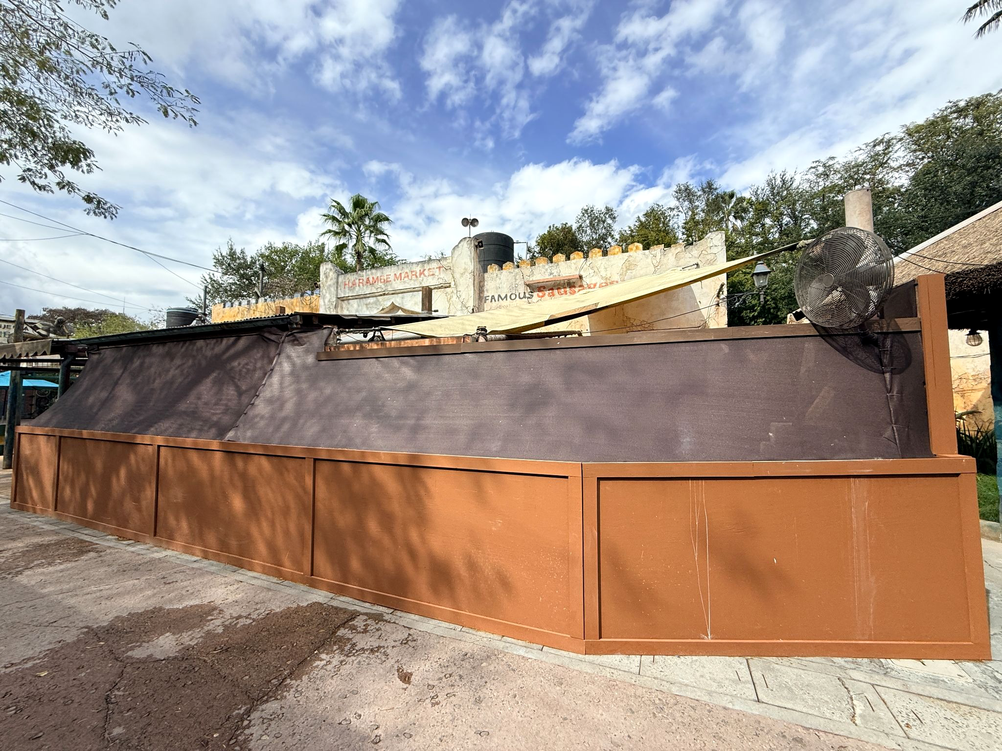 The newly installed construction walls wrap around a portion of Harambe Market’s former mobile order pick-up windows, while black scrim stretches between the awnings and the walls to fully block the space from guest view. The setup suggests significant interior and operational changes are underway as Disney transitions the venue to its new concept.