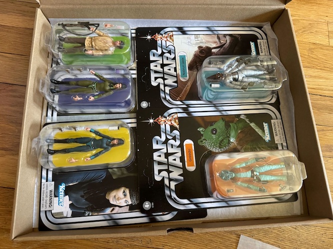 - The set includes five 3 ¾-inch scale The Vintage Collection action figures: Greedo, Wuher the bartender, Nabrun Leids, and the two Tonnika sisters (which have never been produced as official Star Wars action figures previously). A sixth figure depicting the background character of Arleil Schous (who also has never made it to action figure form) was sadly not unlocked due to the campaign not reaching enough backers.