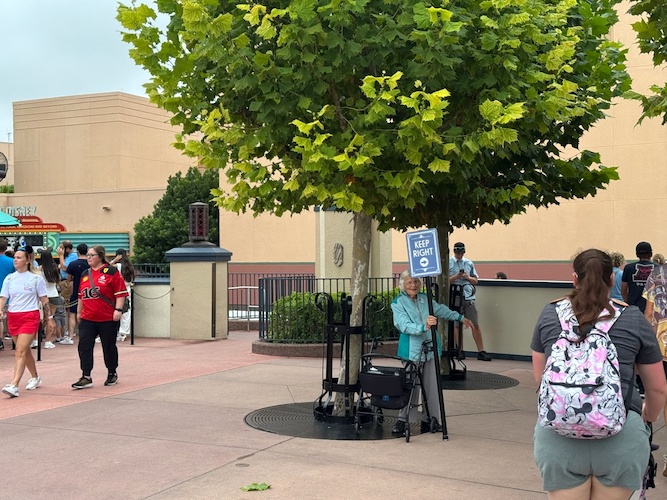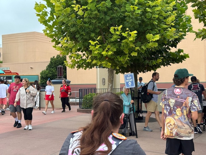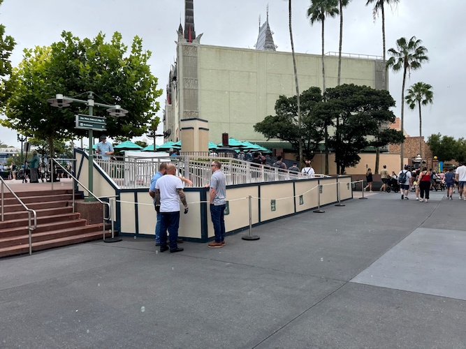 If looking at the archway, to the left is the only access down into the area that accesses Pixar Plaza, Toy Story Land, and Walt Disney Presents. Portions of the stairway remains accessible for travel coming from or going to this area, while Cast Members direct traffic to one-way ramps nearby, with a temporary ramp installed for those coming down into the area, while the permanent ramp that has always been is for leaving the area and heading back toward the Chinese Theater.