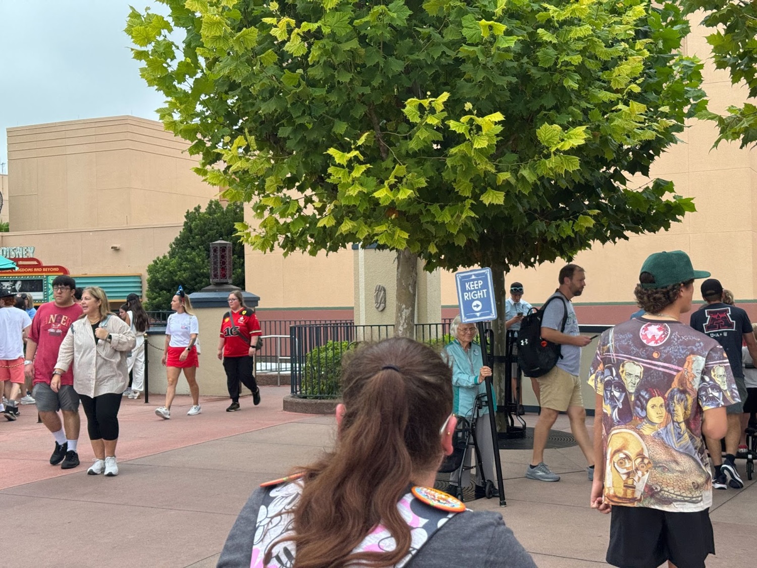 If looking at the archway, to the left is the only access down into the area that accesses Pixar Plaza, Toy Story Land, and Walt Disney Presents. Portions of the stairway remains accessible for travel coming from or going to this area, while Cast Members direct traffic to one-way ramps nearby, with a temporary ramp installed for those coming down into the area, while the permanent ramp that has always been is for leaving the area and heading back toward the Chinese Theater.