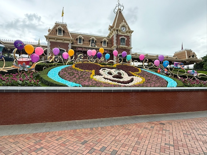 - Upon entering the park, a festive Mickey floral display, which can be seen above, features balloons and bright colors, giving guests a taste of what lies beyond the berm.