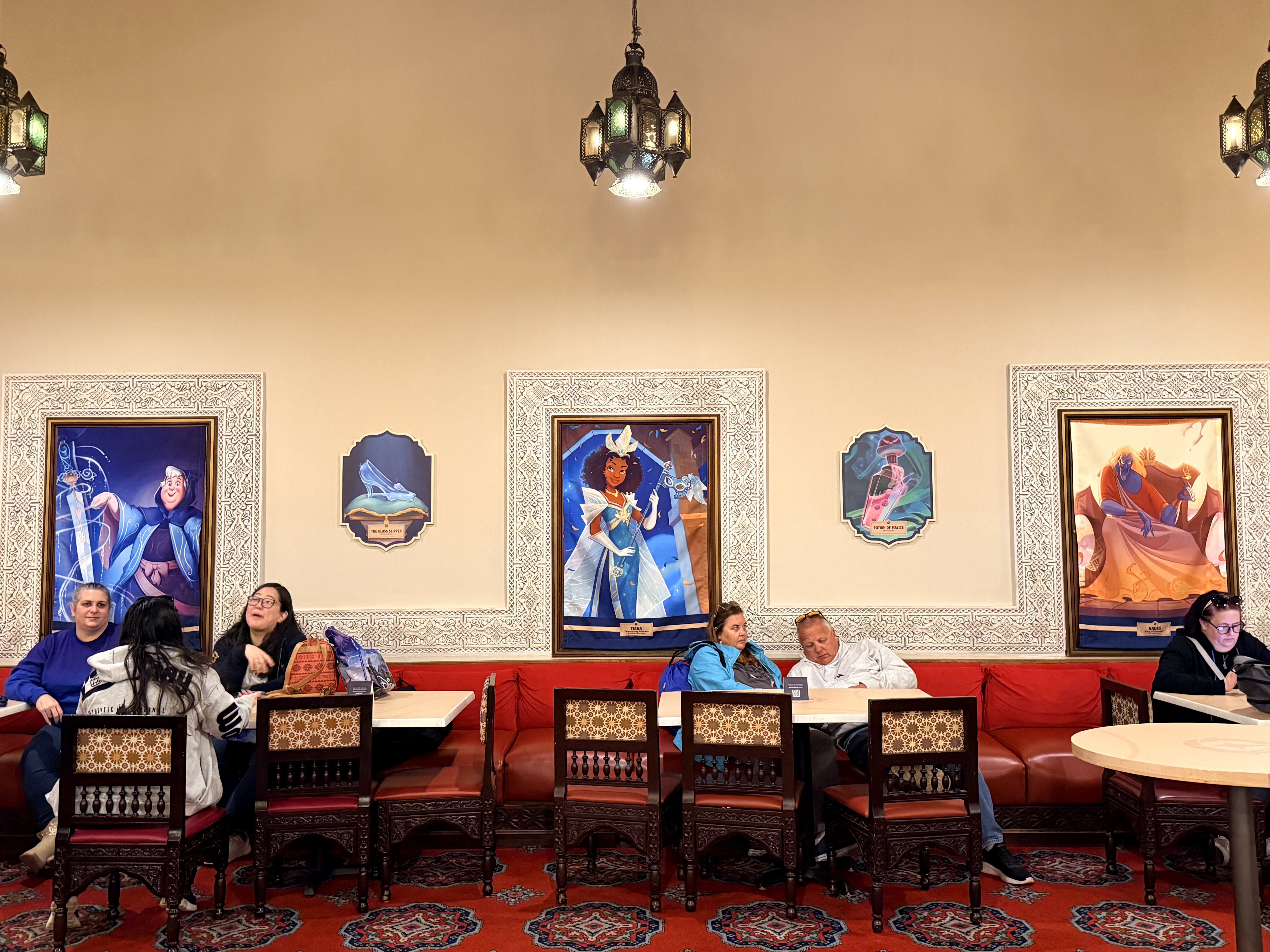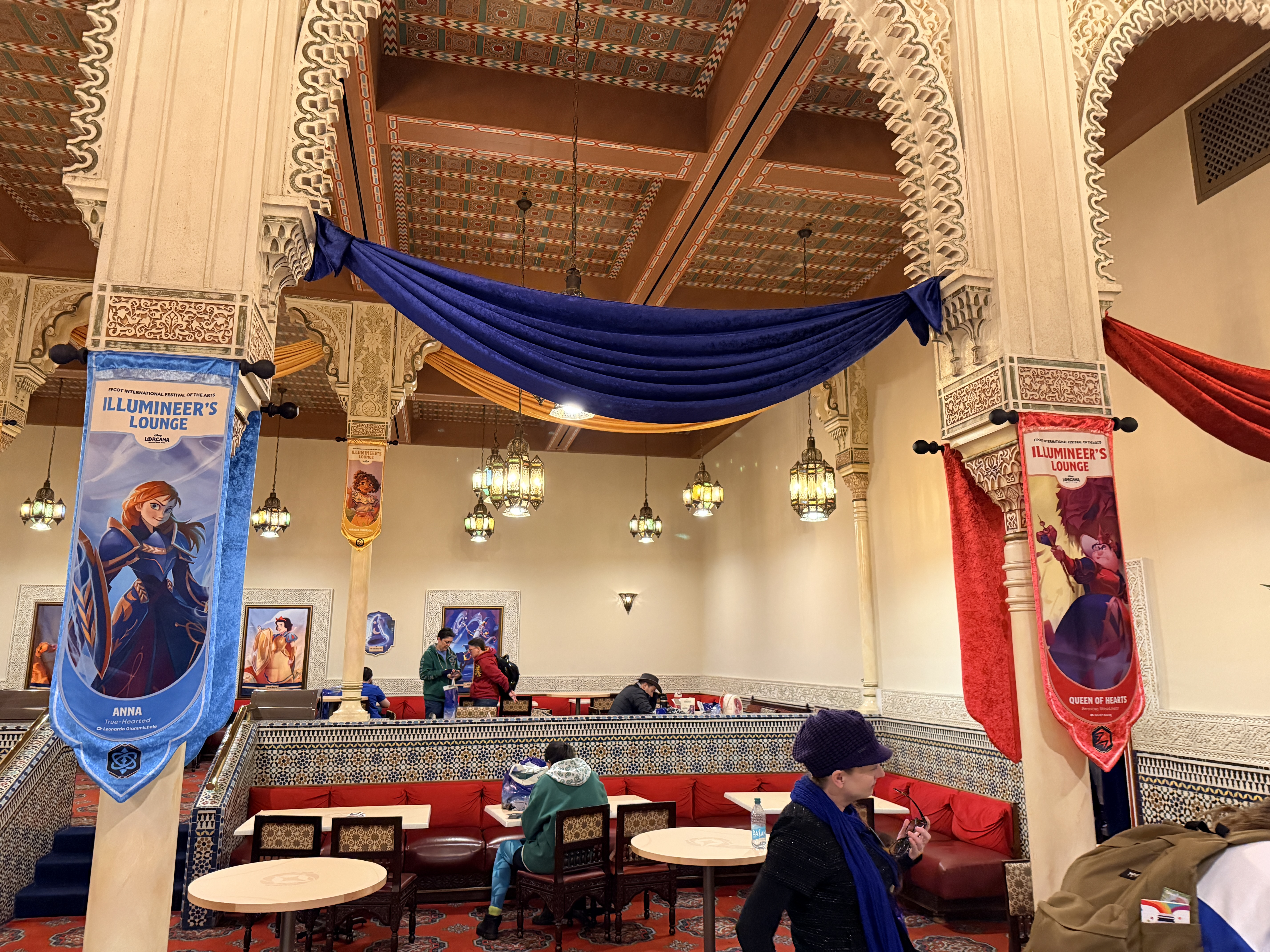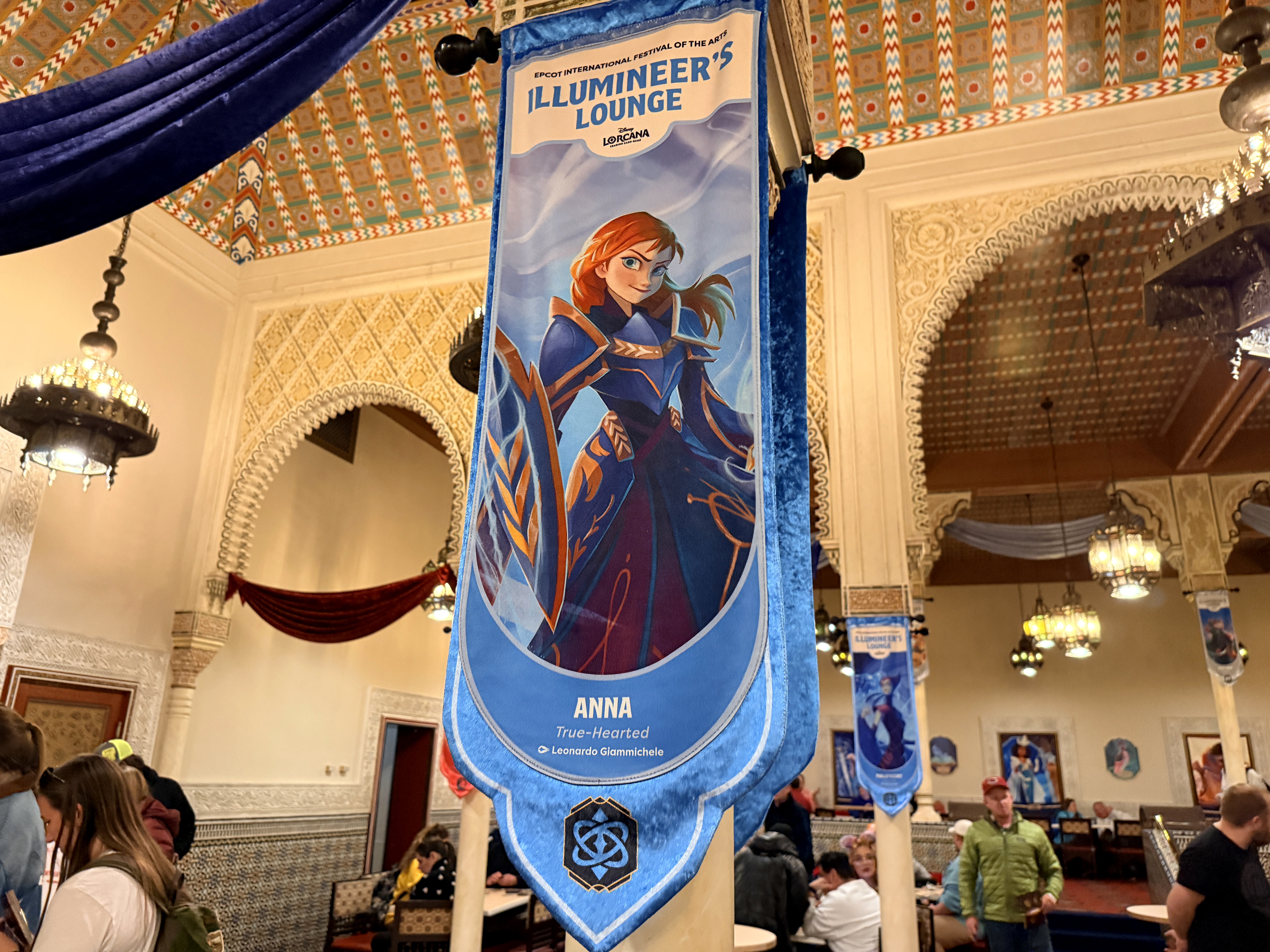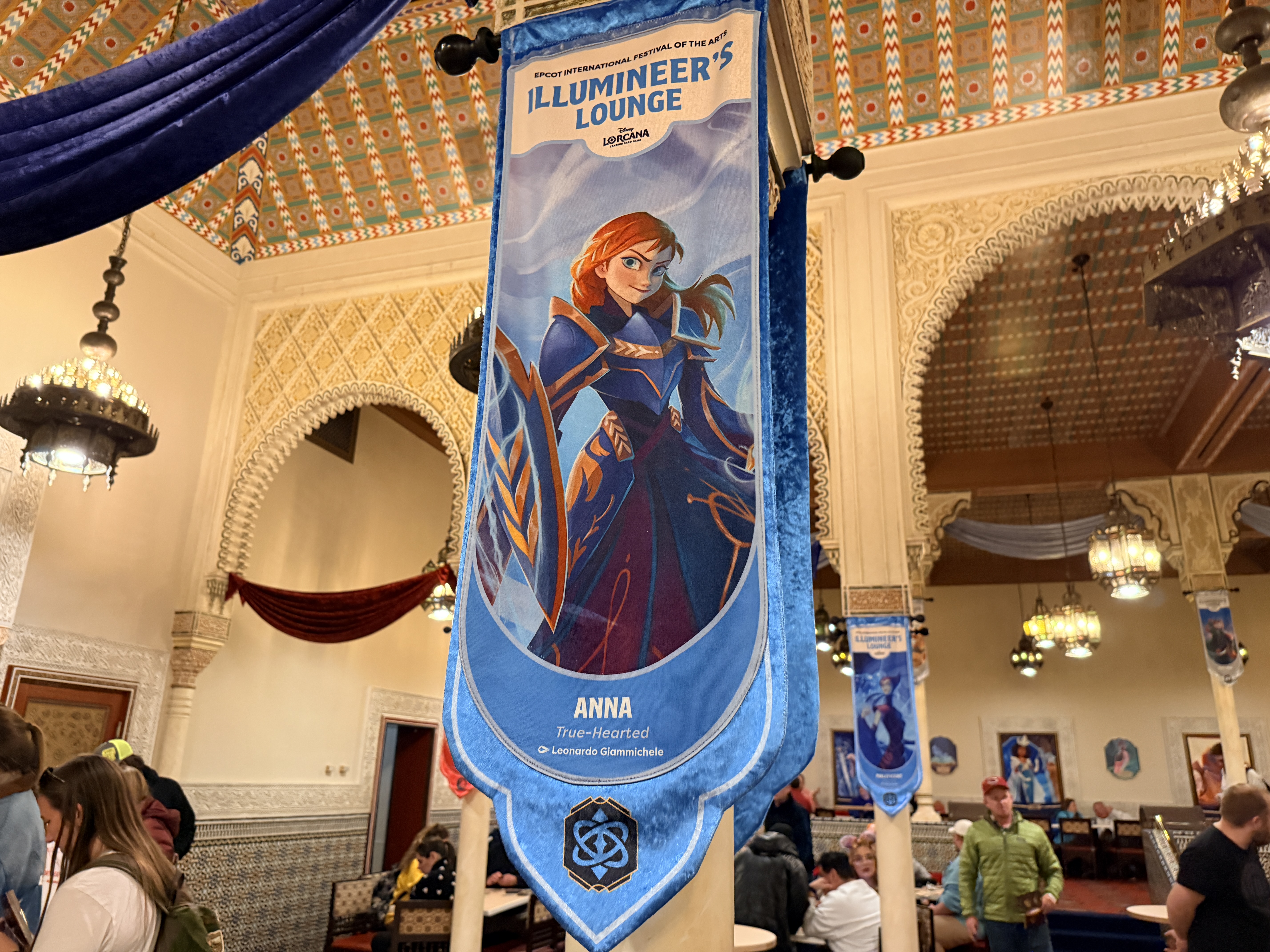 Inside, the former Restaurant Marrakesh is decked out with banners featuring Lorcana card art.