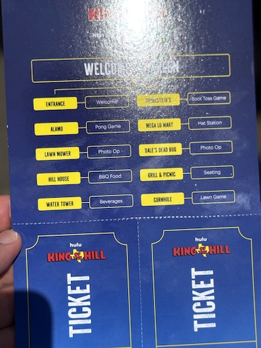 Upon entering, those who stop by will be handed a sheet of tickets that allows them to partake in the various activities offered at the location, as well as some swag and snacks. Sure to be a big draw is a hat station themed to the Mega Lo Mart from the series, where (with their ticket) guests can stop by and pick out their hat color and themed patch (marking a King of the Hill location or brand) and have it made instantly.