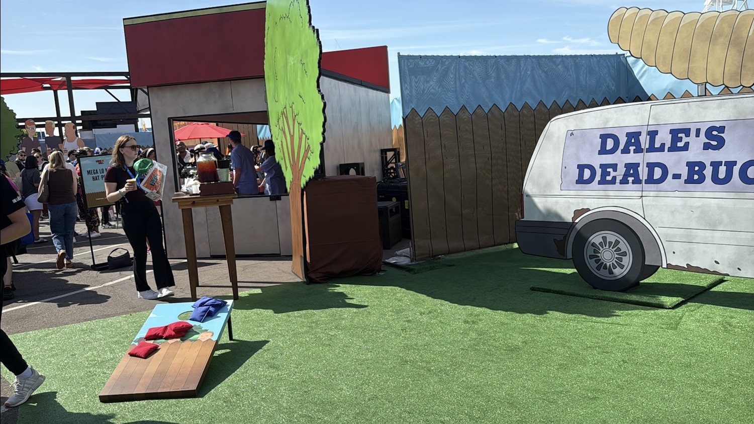 Upon entering, those who stop by will be handed a sheet of tickets that allows them to partake in the various activities offered at the location, as well as some swag and snacks. Sure to be a big draw is a hat station themed to the Mega Lo Mart from the series, where (with their ticket) guests can stop by and pick out their hat color and themed patch (marking a King of the Hill location or brand) and have it made instantly.