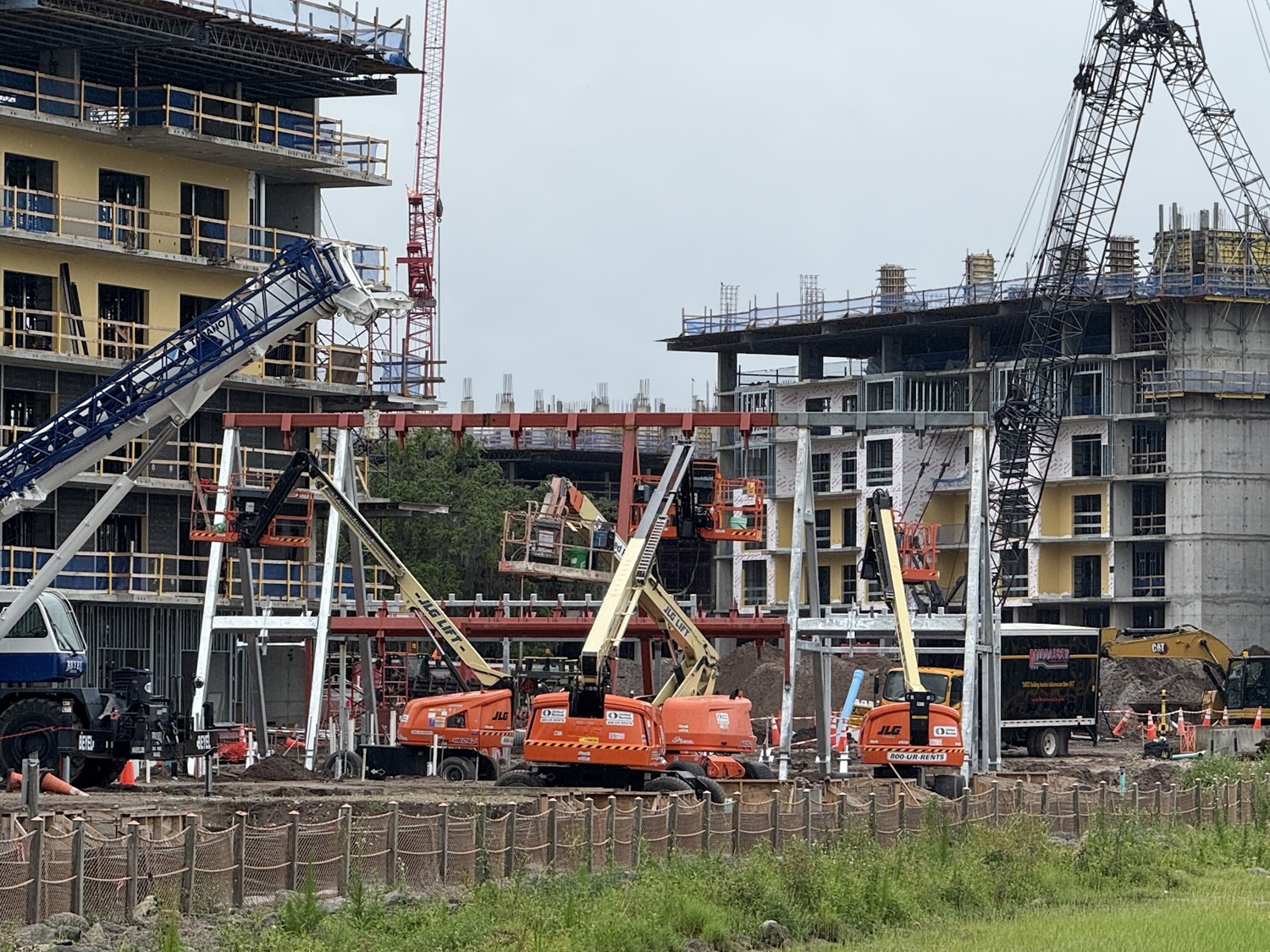 In our last update, we noticed that the new resort will tower over the adjacent Pioneer Hall at Disney’s Fort Wilderness, and that seems to only have grown, with the building going a bit more vertical since the last update. More of the rooms have also been enclosed with more work being done on the floors that have already been completed.