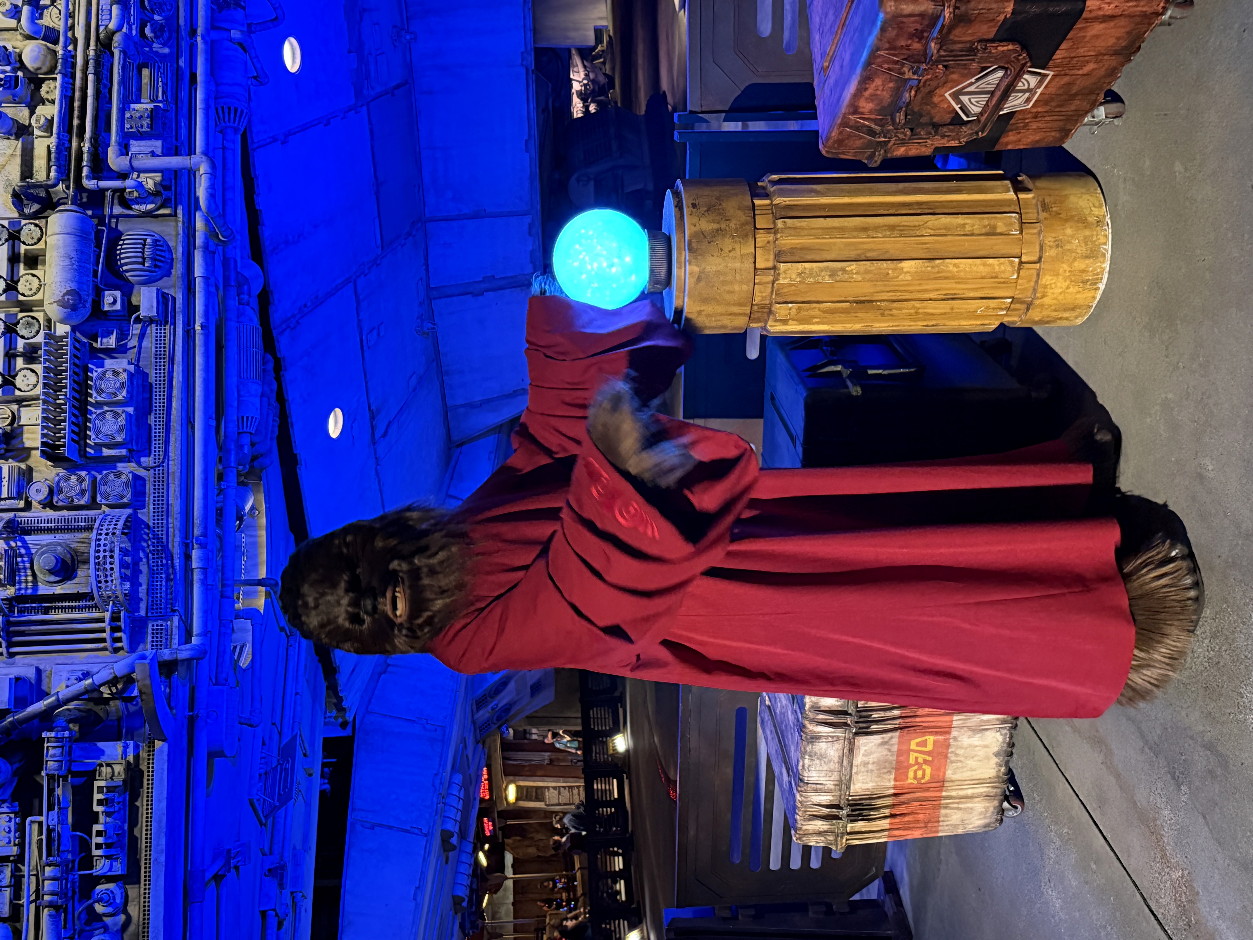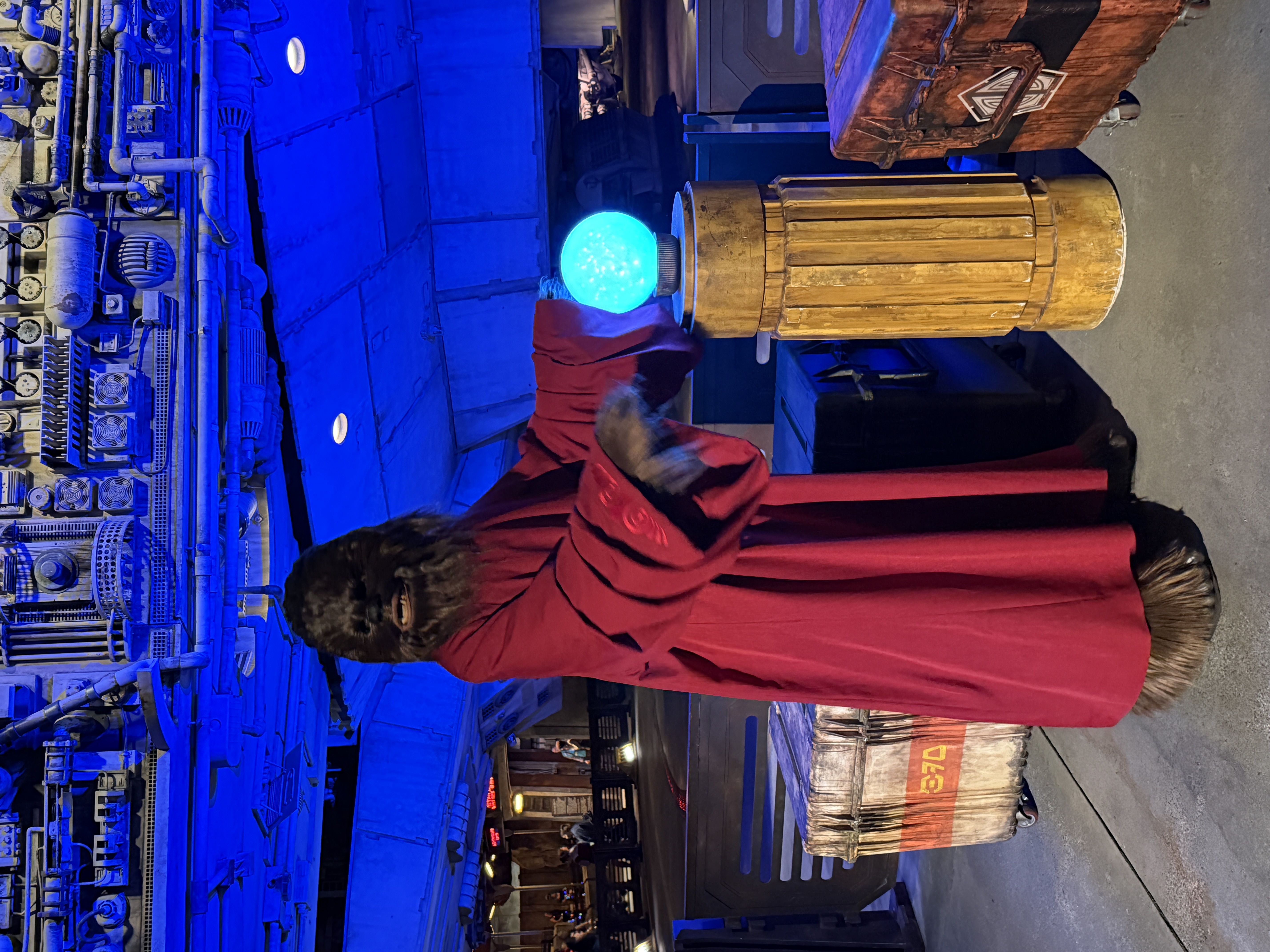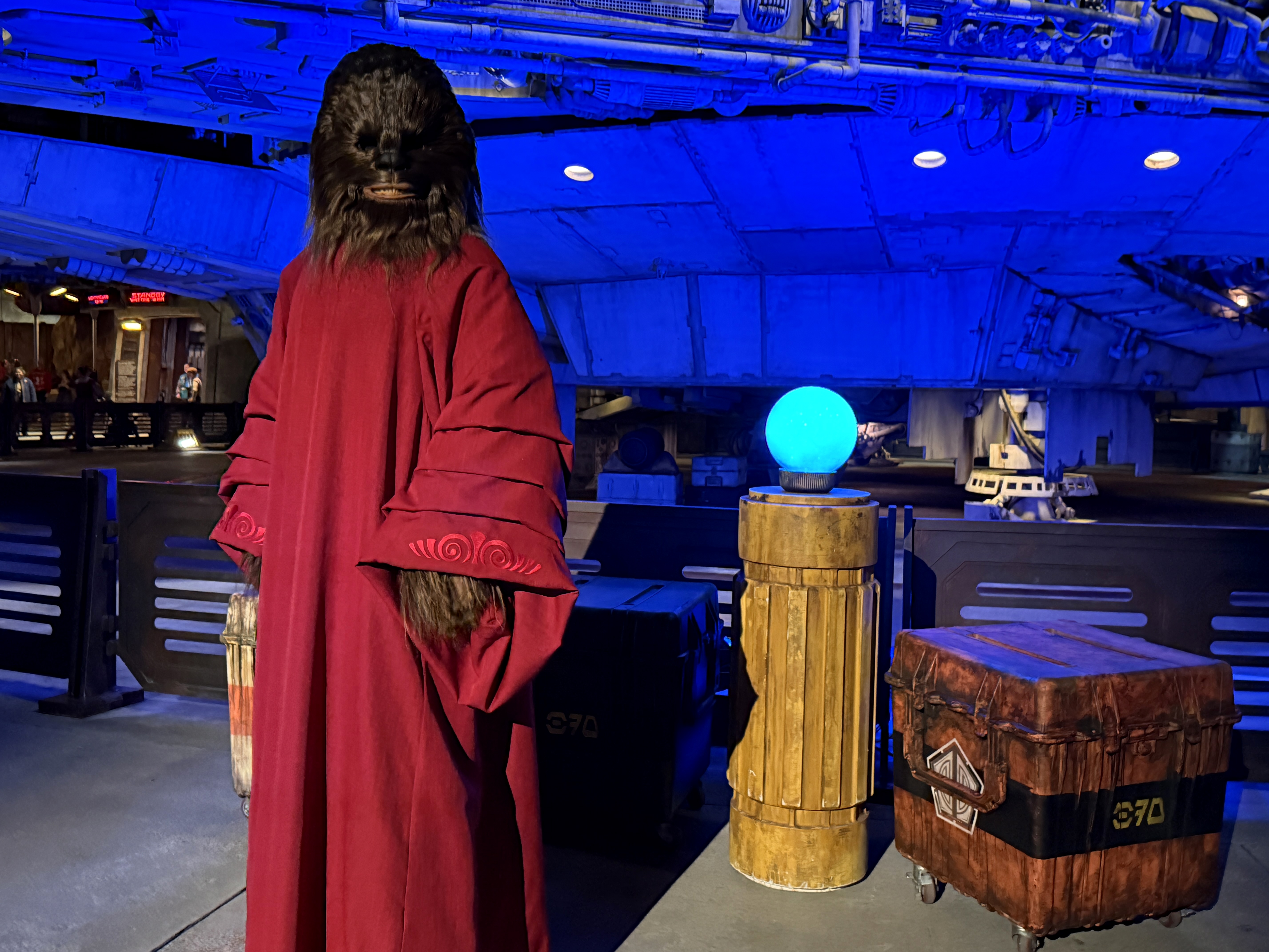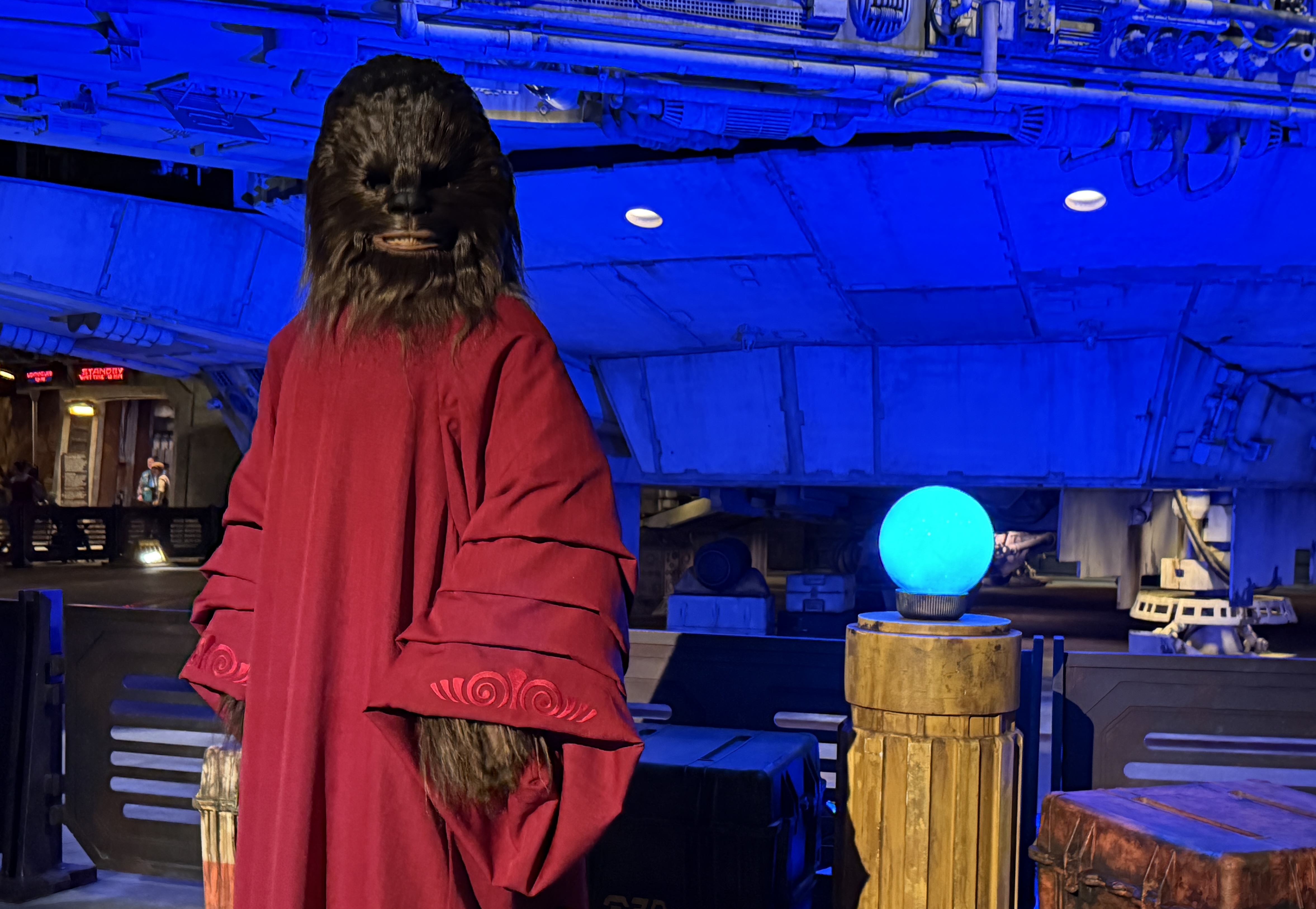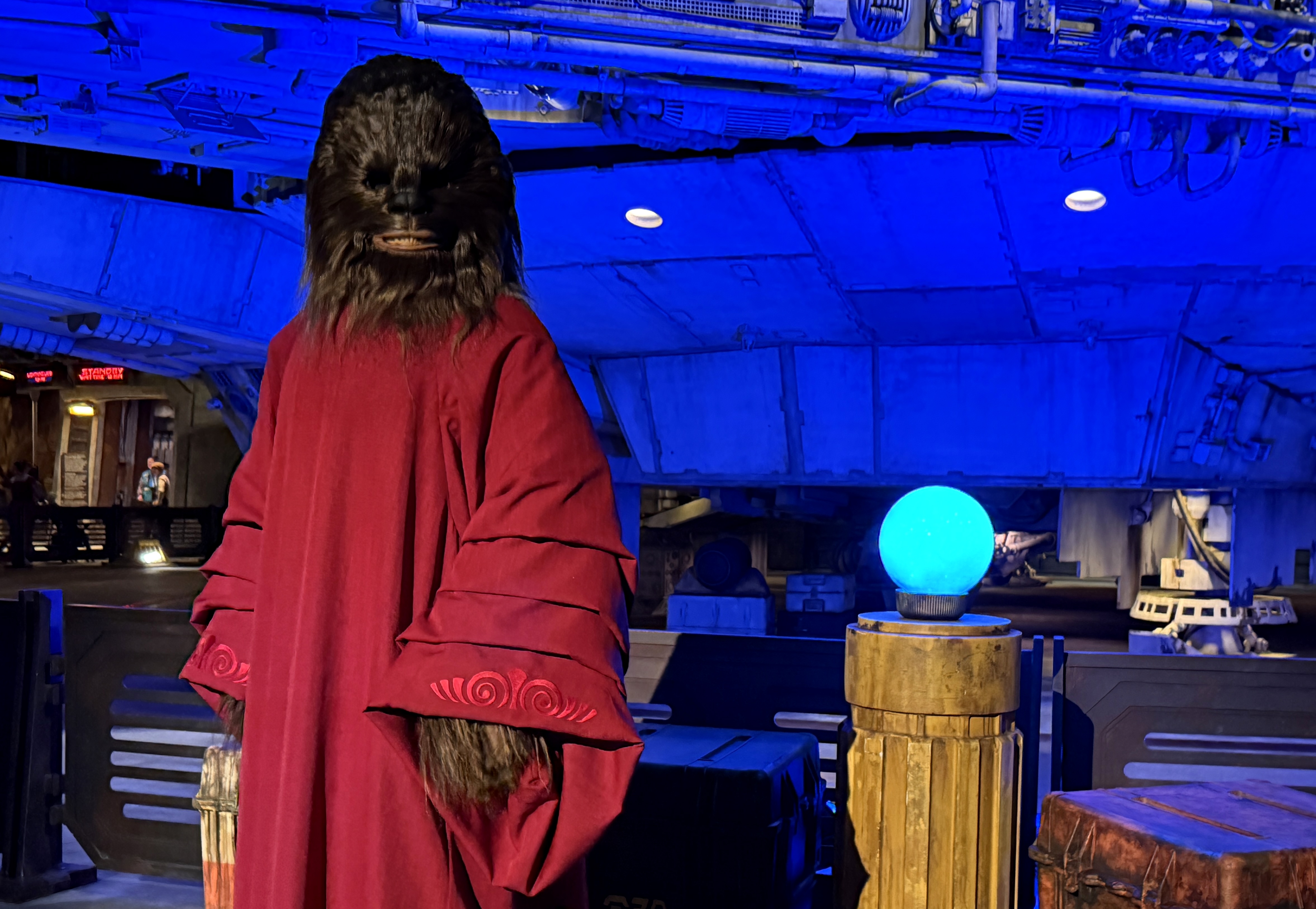 - Chewbacca sports a red cloak, complete with a "Life Day Orb," in Star Wars: Galaxy's Edge at both Disneyland and Disney's Hollywood Studios.