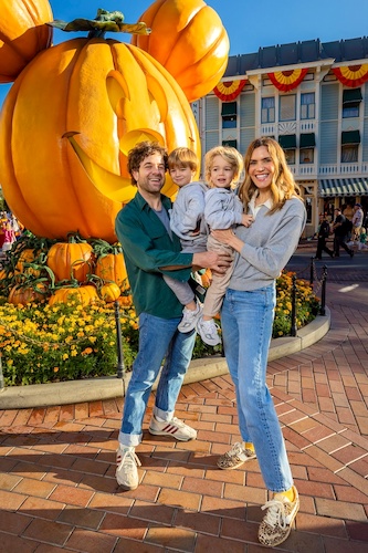 - Mandy, her two children, and husband, musician Taylor Goldsmith, posed for a photo with the iconic Pumpkin Mickey on Main Street, U.S.A.