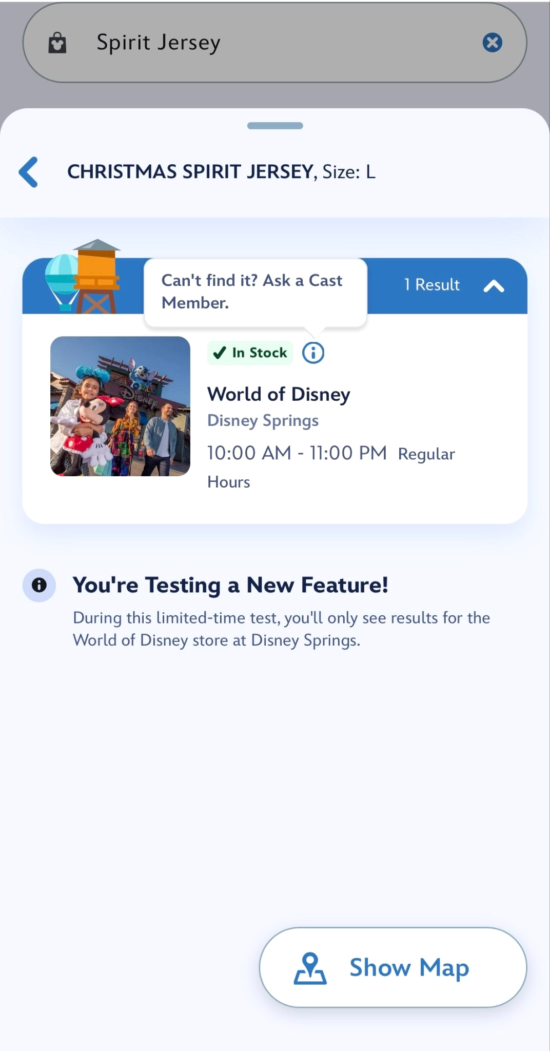 - In years past, Cast Members could assist guests in retail locations with a merchandise finder system (perhaps an earlier iteration of this one), guiding guests to other locations where a sold-out item or say, a Spirit Jersey in a different size could be found. However, this system was only available to Cast Members, now seemingly moving into the palm of guests' hands with this new system.