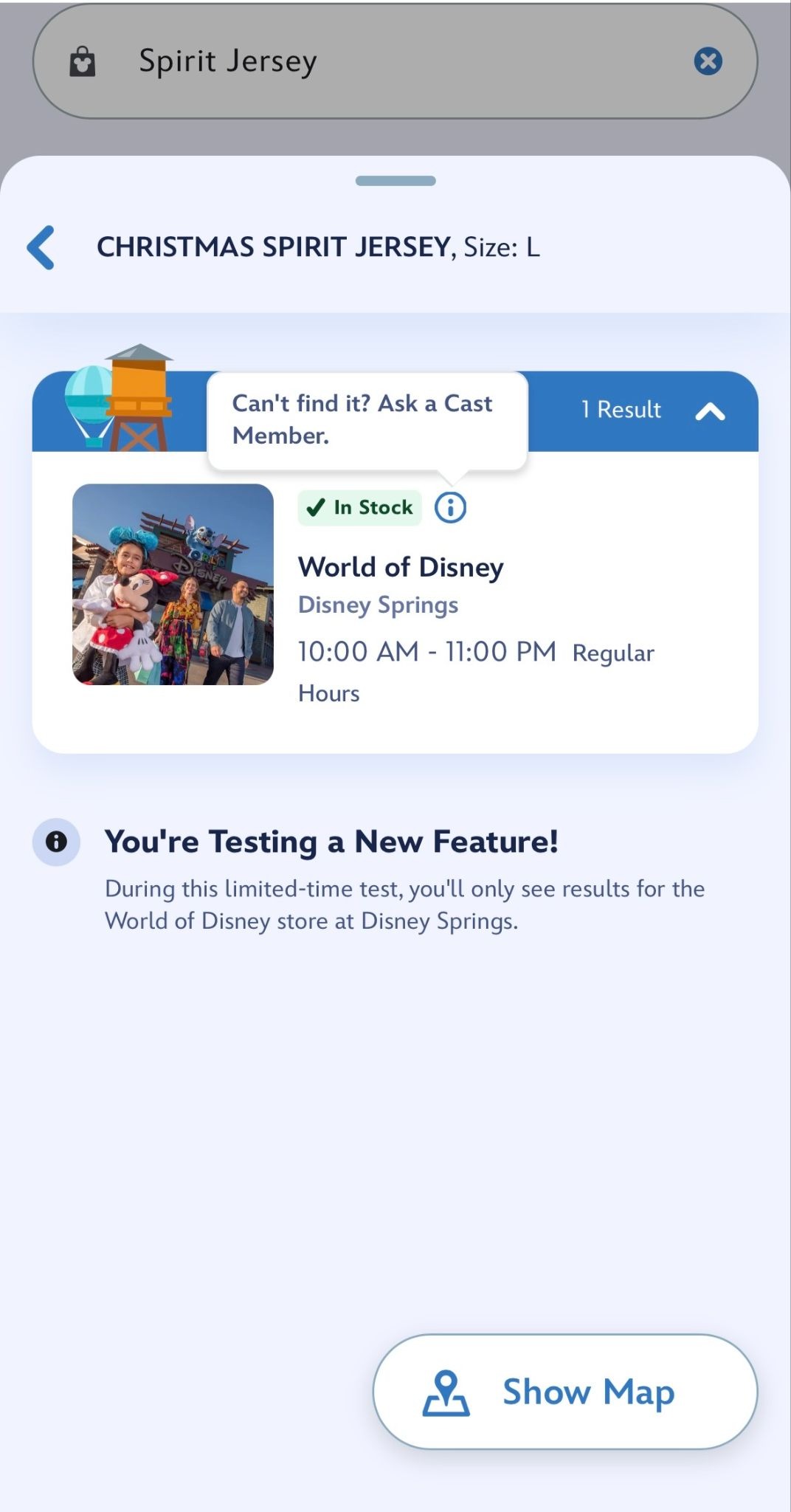 - In years past, Cast Members could assist guests in retail locations with a merchandise finder system (perhaps an earlier iteration of this one), guiding guests to other locations where a sold-out item or say, a Spirit Jersey in a different size could be found. However, this system was only available to Cast Members, now seemingly moving into the palm of guests' hands with this new system.