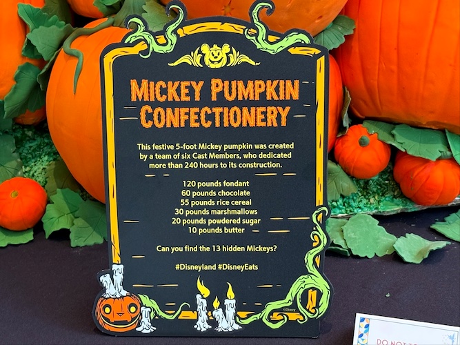 - As tends to be the case with these confectionery wonders in the Disneyland Resort hotel lobbies, its creators have hidden a grand total of 13 Hidden Mickeys around the pumpkin. We’ve zoomed in on one of them in the photo below, but you’ll have to visit the Disneyland Hotel to find all 13.