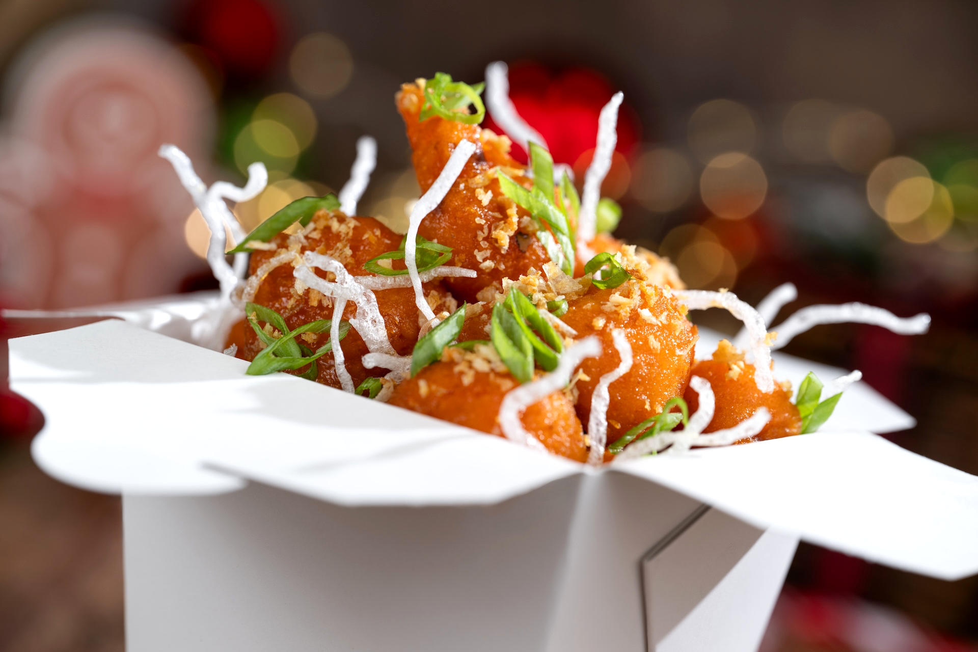 - Orange Chicken Strips drizzled with orange-soy glaze, glass noodles, green onions, and crispy garlic (Available during Mickey’s Very Merry Christmas Party only)