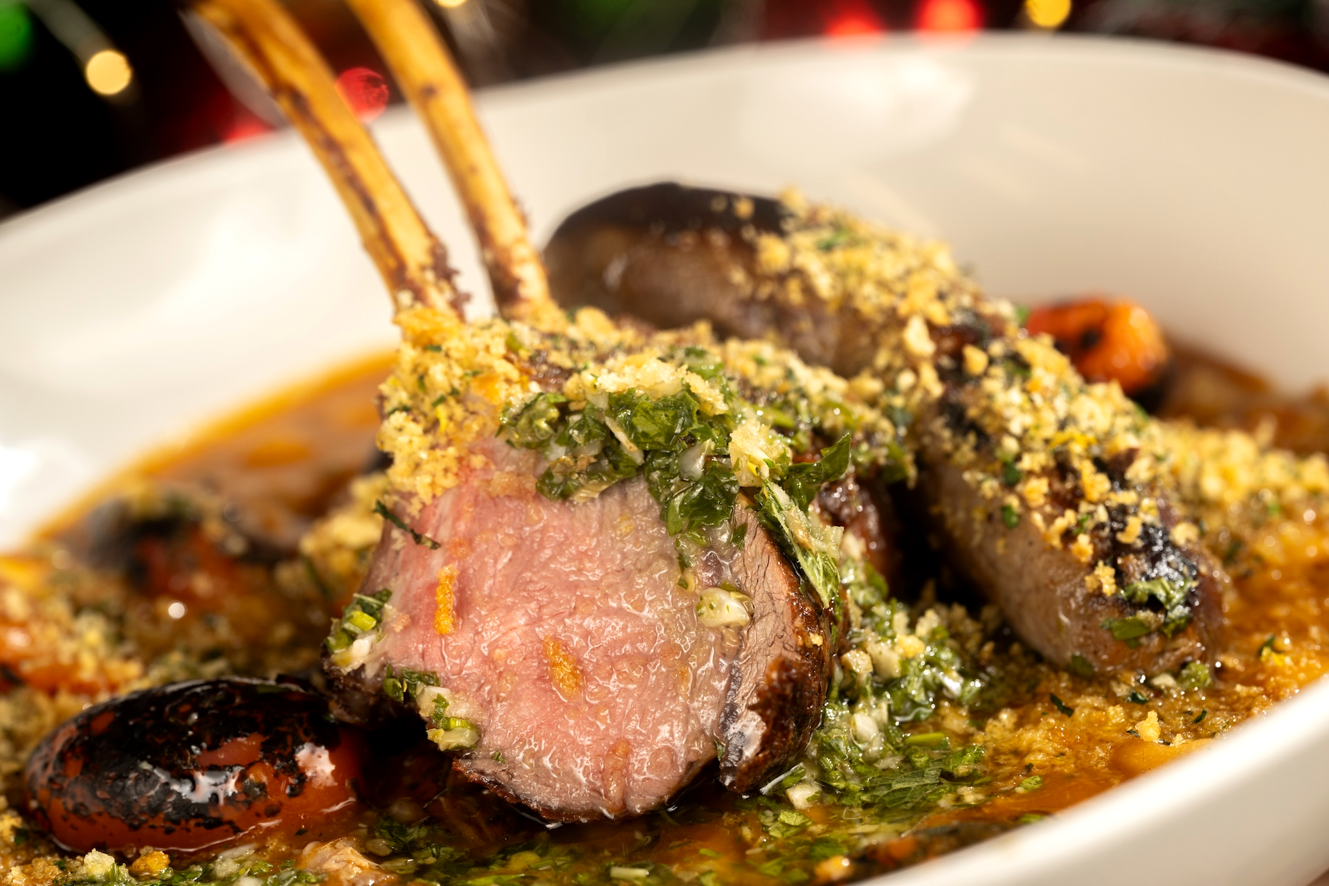 - Roasted Lamb Chops: Potatoes au gratin, honey-glazed carrots, and cabernet-cherry jus (Available during Mickey’s Very Merry Christmas Party only) (New)