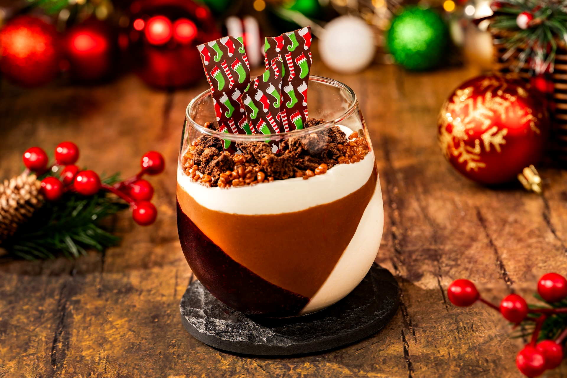 - Flourless Black Forest Trifle: Layers of cherry liqueur compote, chocolate crémeux, chantilly cream, and festive chocolate pieces (Available during Mickey’s Very Merry Christmas Party only) (New)