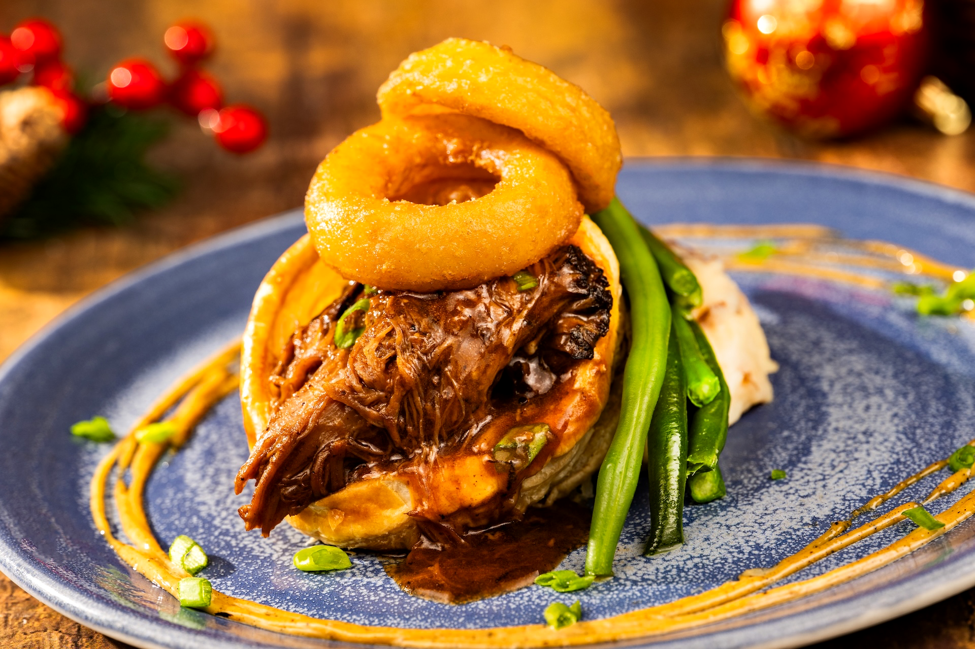 - Holiday Beef Pot Roast served in a puff pastry crust with mashed potatoes, beer-battered onion rings, and black garlic-truffle aïoli (Available during Mickey’s Very Merry Christmas Party and regular park hours) (New)
