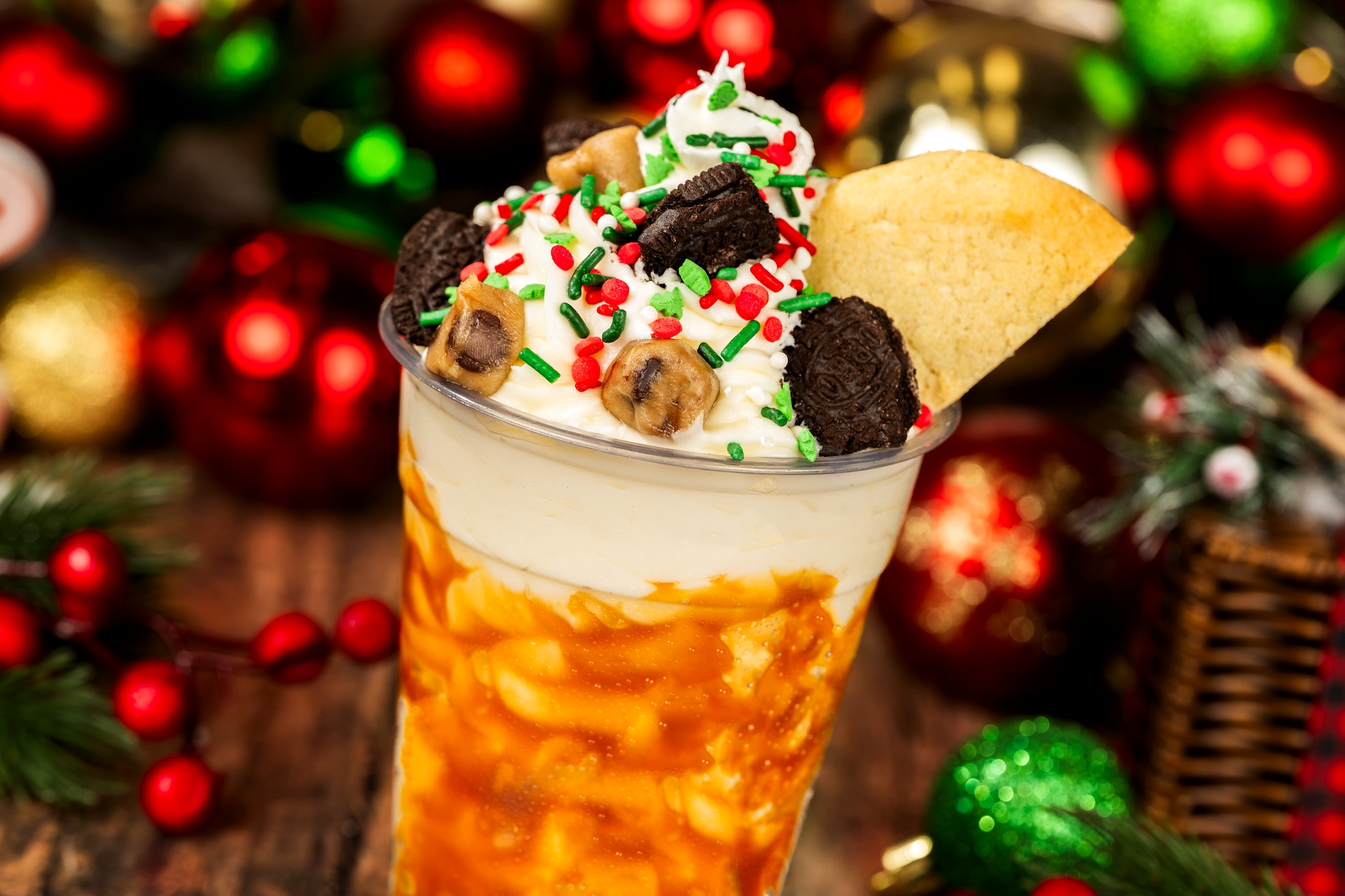 - Milk and Cookies Shake: Vanilla shake with caramel, holiday cookies, and chocolate chip cookie dough topped with whipped cream and festive sprinkles (Non-alcoholic) (Available during Mickey’s Very Merry Christmas Party only) (New)