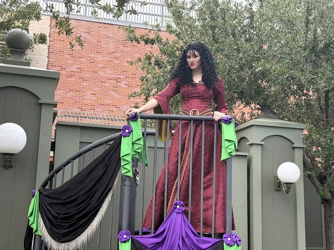 - Said list notes that Mother Gothel will be appearing in Mickey’s Boo-To-You Halloween Parade, but doesn’t list her as a meet and greet character. We, however, found her talking to guests as they entered the event via the Main Street bypass.